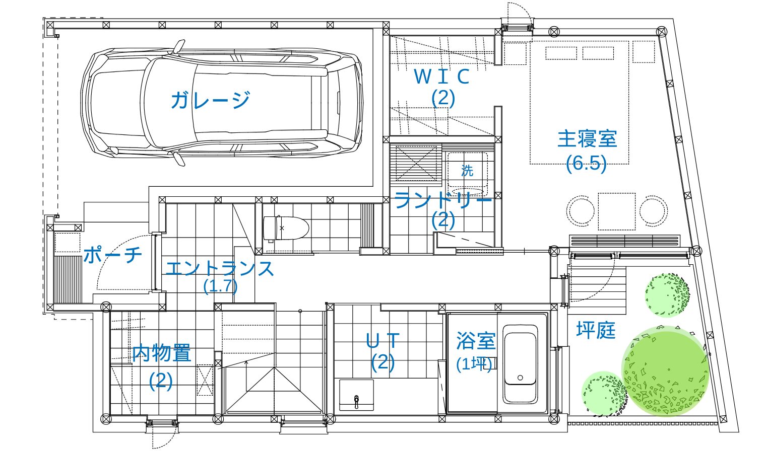 LDK・寝室・浴室を坪庭に面して配置することで、限られた敷地でも各室が緑と光に向かって開くようにしました。