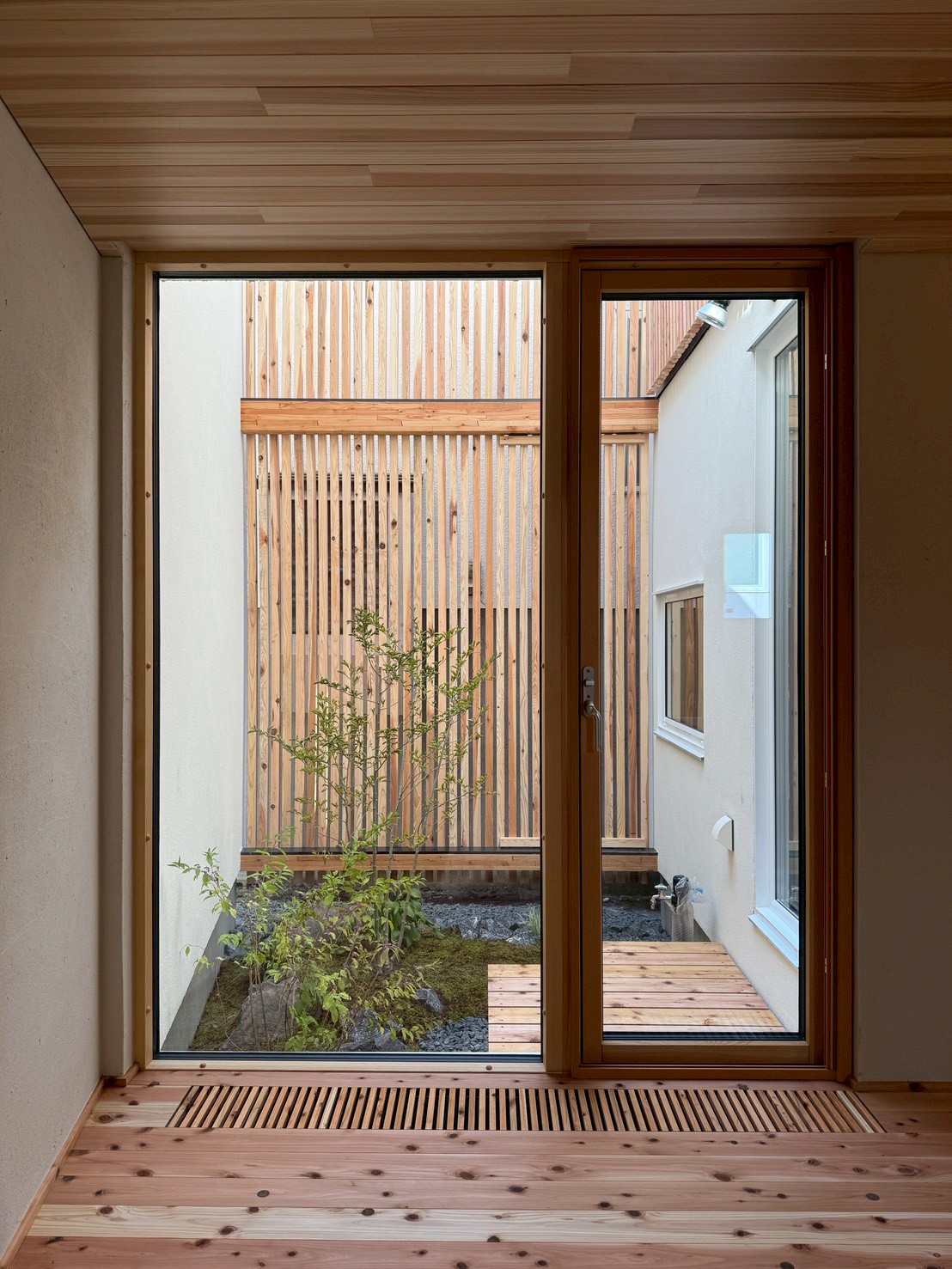 外に向かうのではなく、内側の庭へ視線を導くことで、密集地でも閉塞感を感じにくくしています。