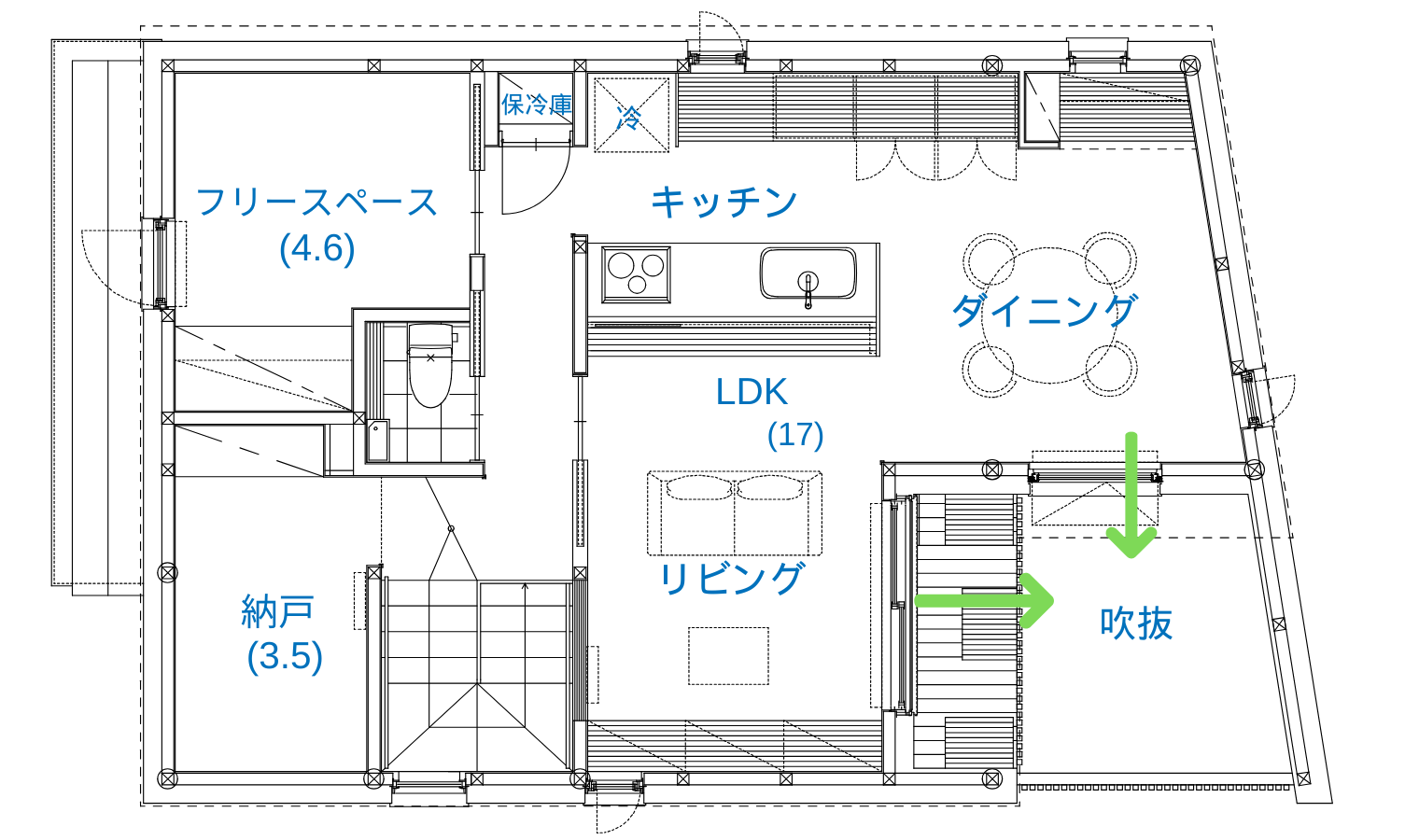 視線の抜けと庭とのつながりによって、実際の面積以上に広がりを感じられる空間を実現しています。