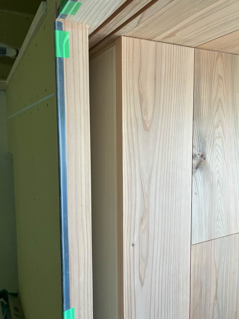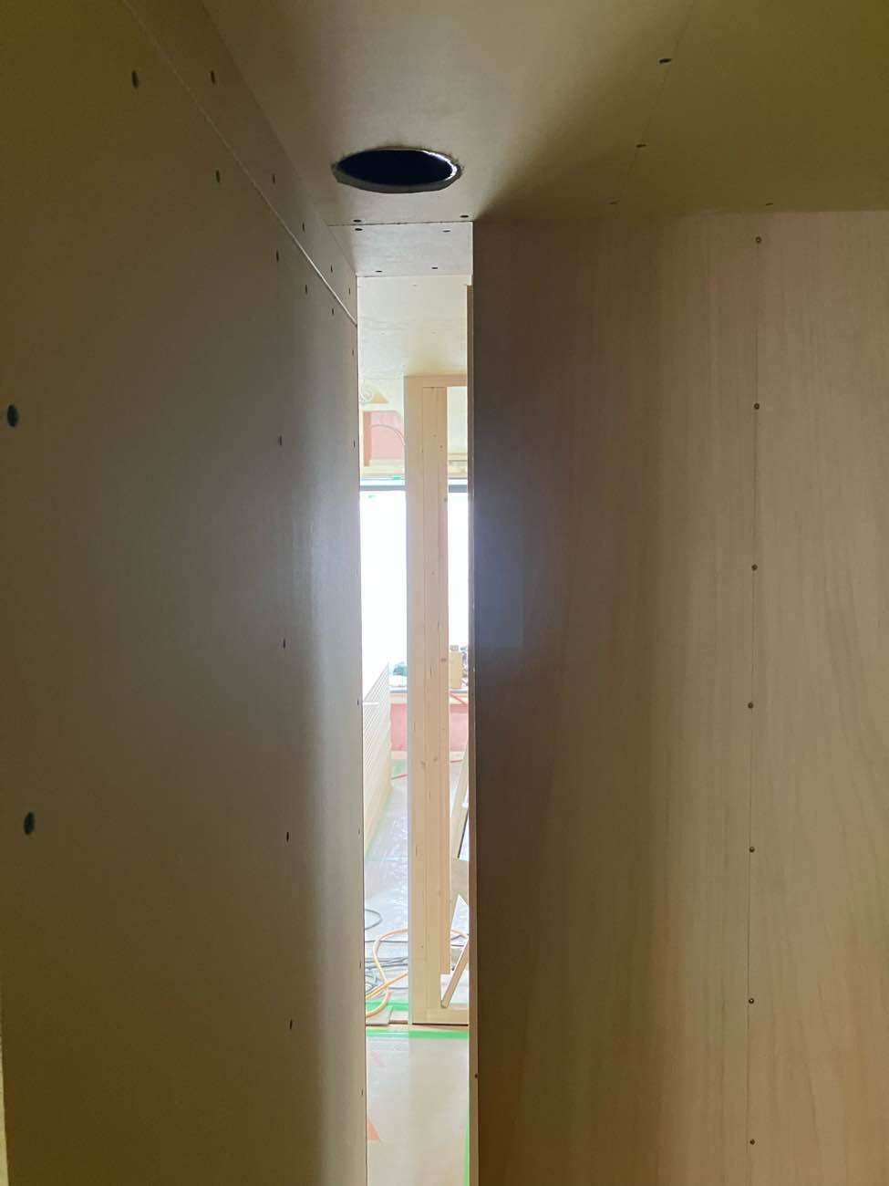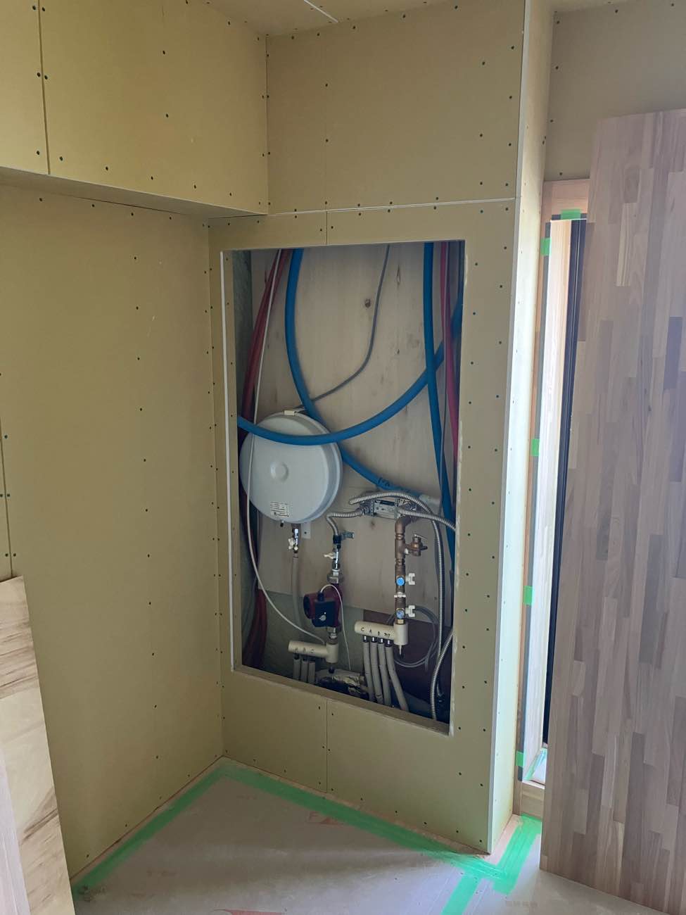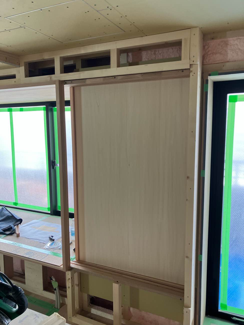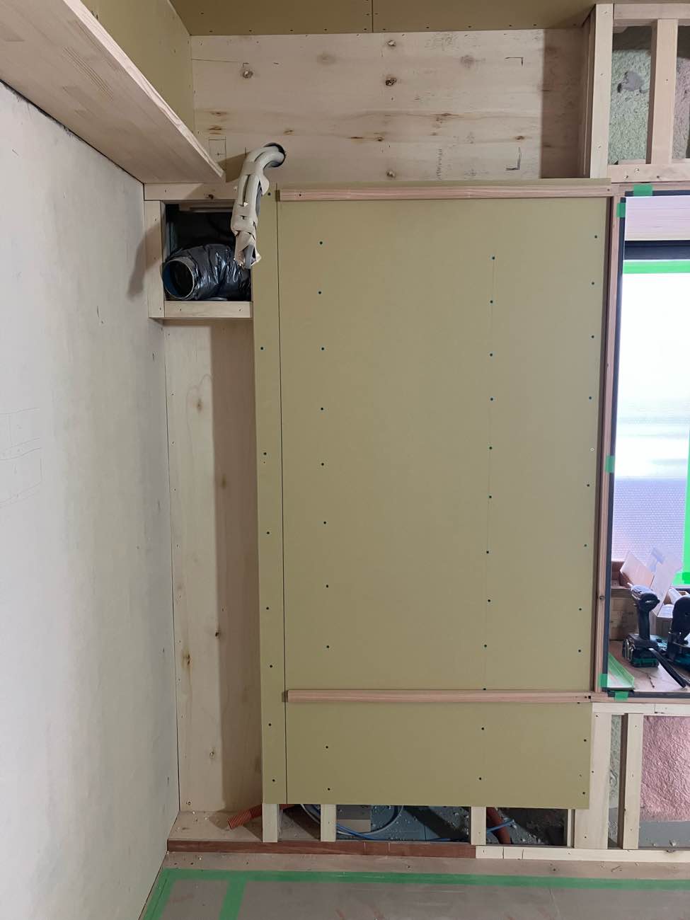 壁の中が少し見えてしまうので、シナベニヤで仕上げています。塞いでしまうと後では手が入らなく仕上げができません‥。