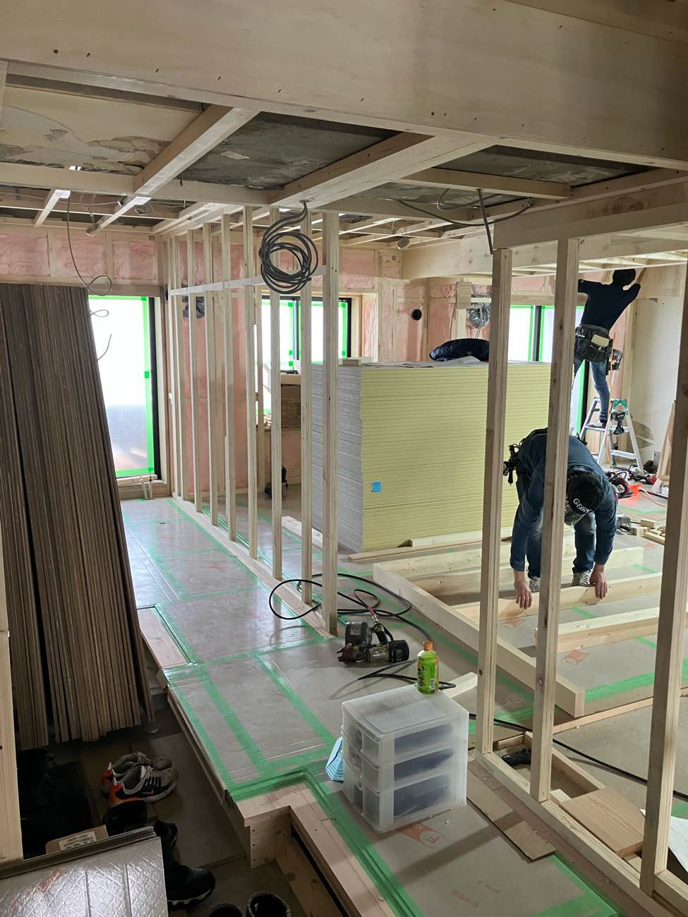 さあ、床張りは終了し、壁と天井のボード搬入されております。