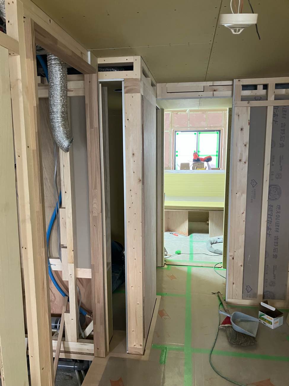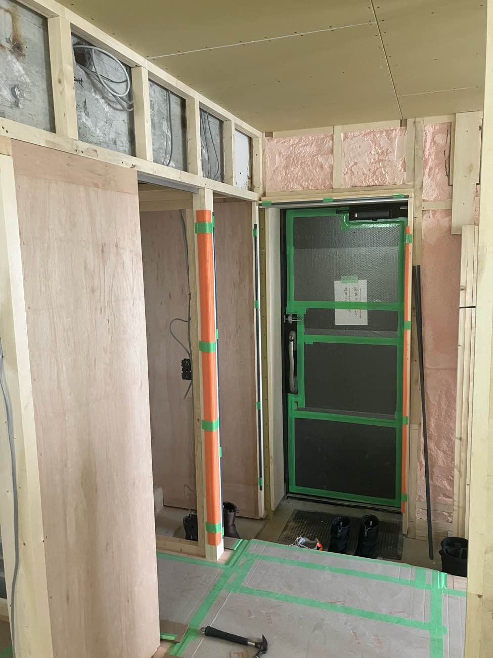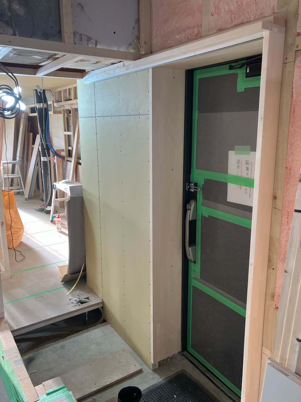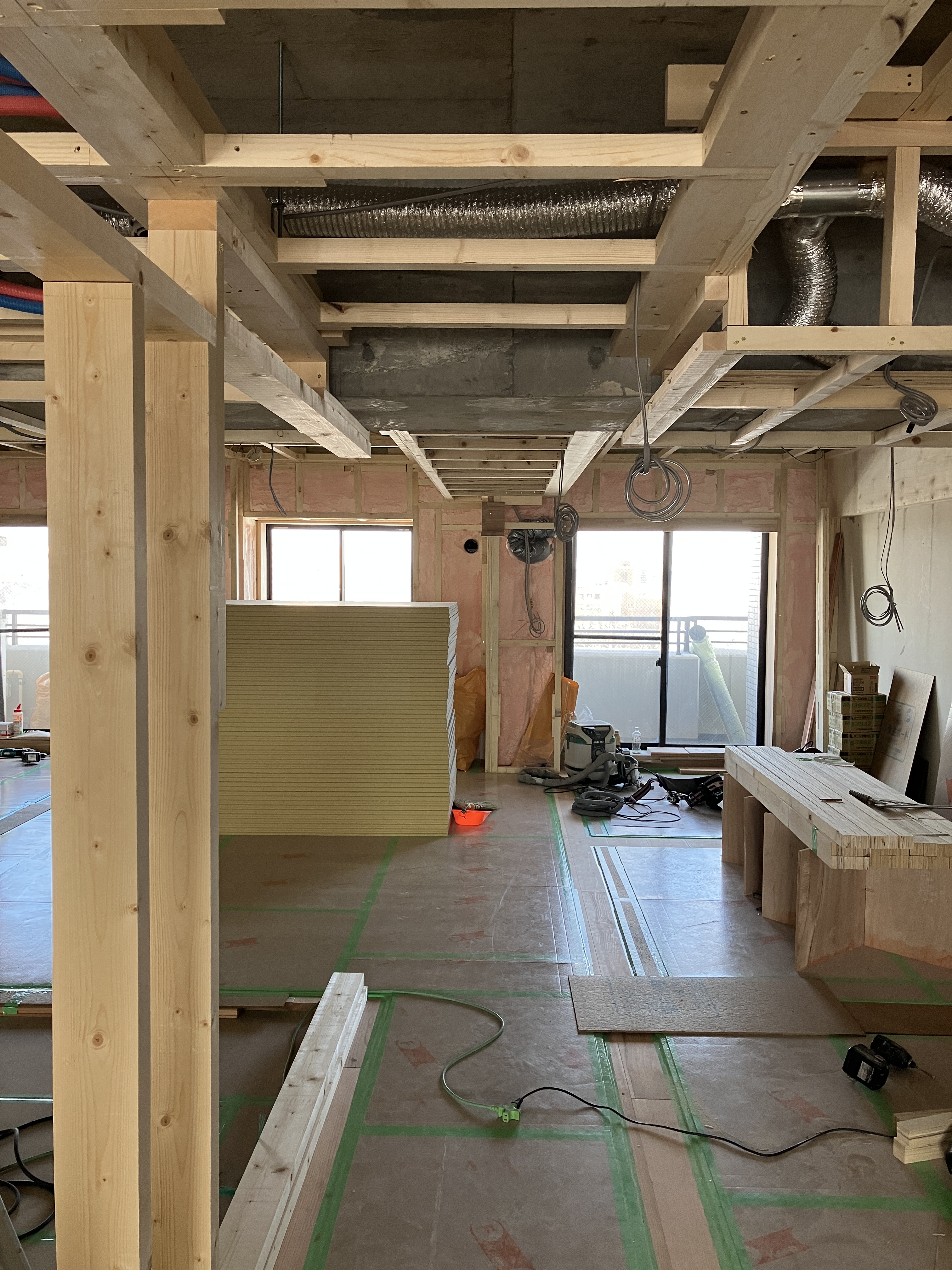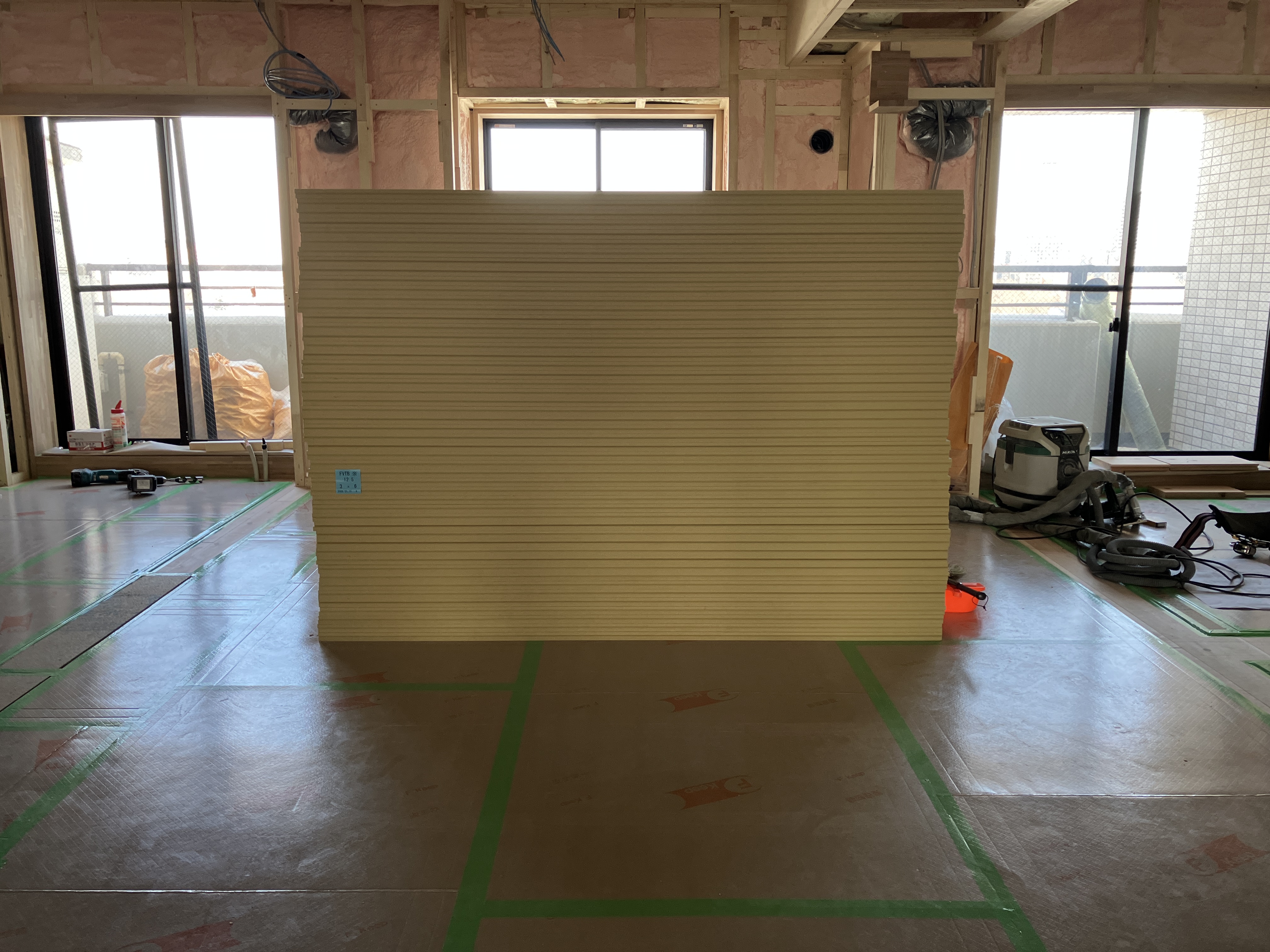 防音上開いてる隙間は、工事中の木くずやほこりが入らないようにする為です。さあ、テープ張りも終了し、次回から本格的に大工工事へと進んでいきます。