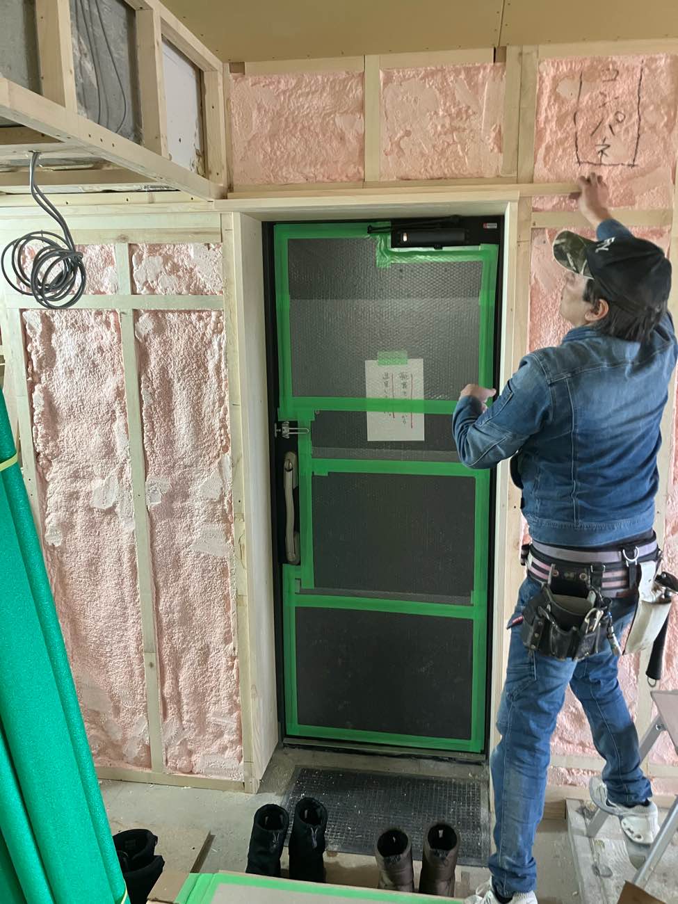 今回は11階という条件もあり、発泡ウレタンを増し吹きしました。付加した断熱材は厚65mmです。