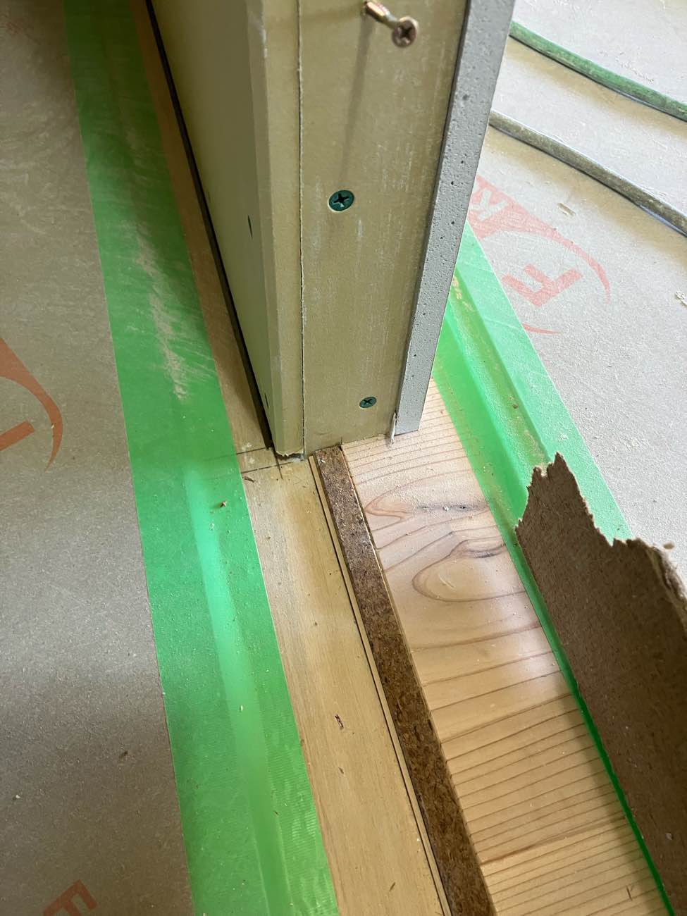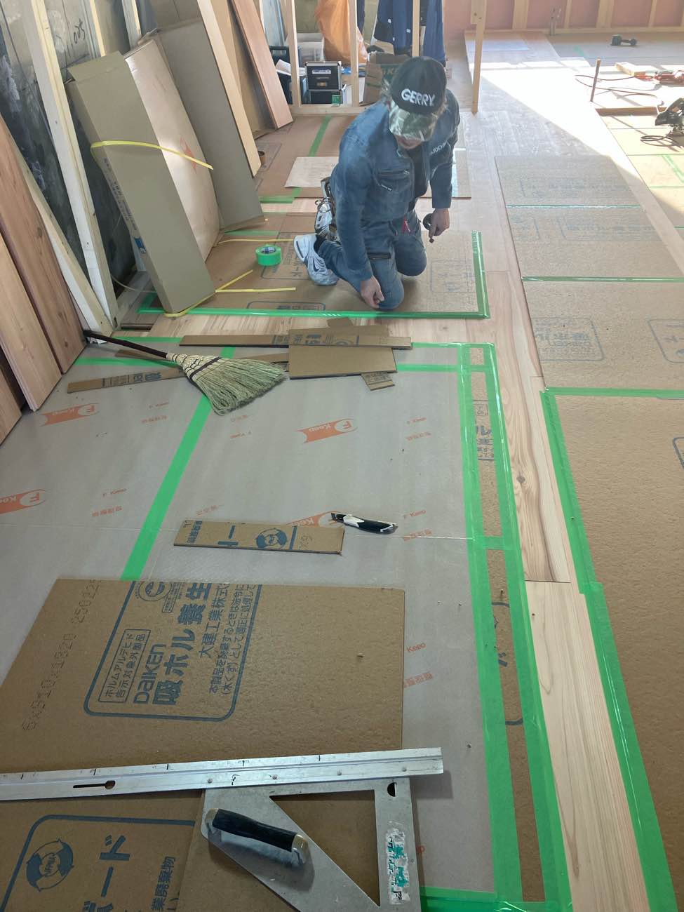 床の下地が終ったら速やかに隙間にテープを張ります。