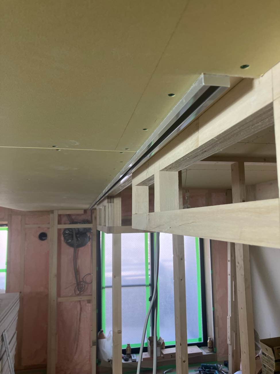 本当は薄茶色のボードを張ってからレールを付けた方が工事は楽なのですが、このレールの厚みは23mmあります。