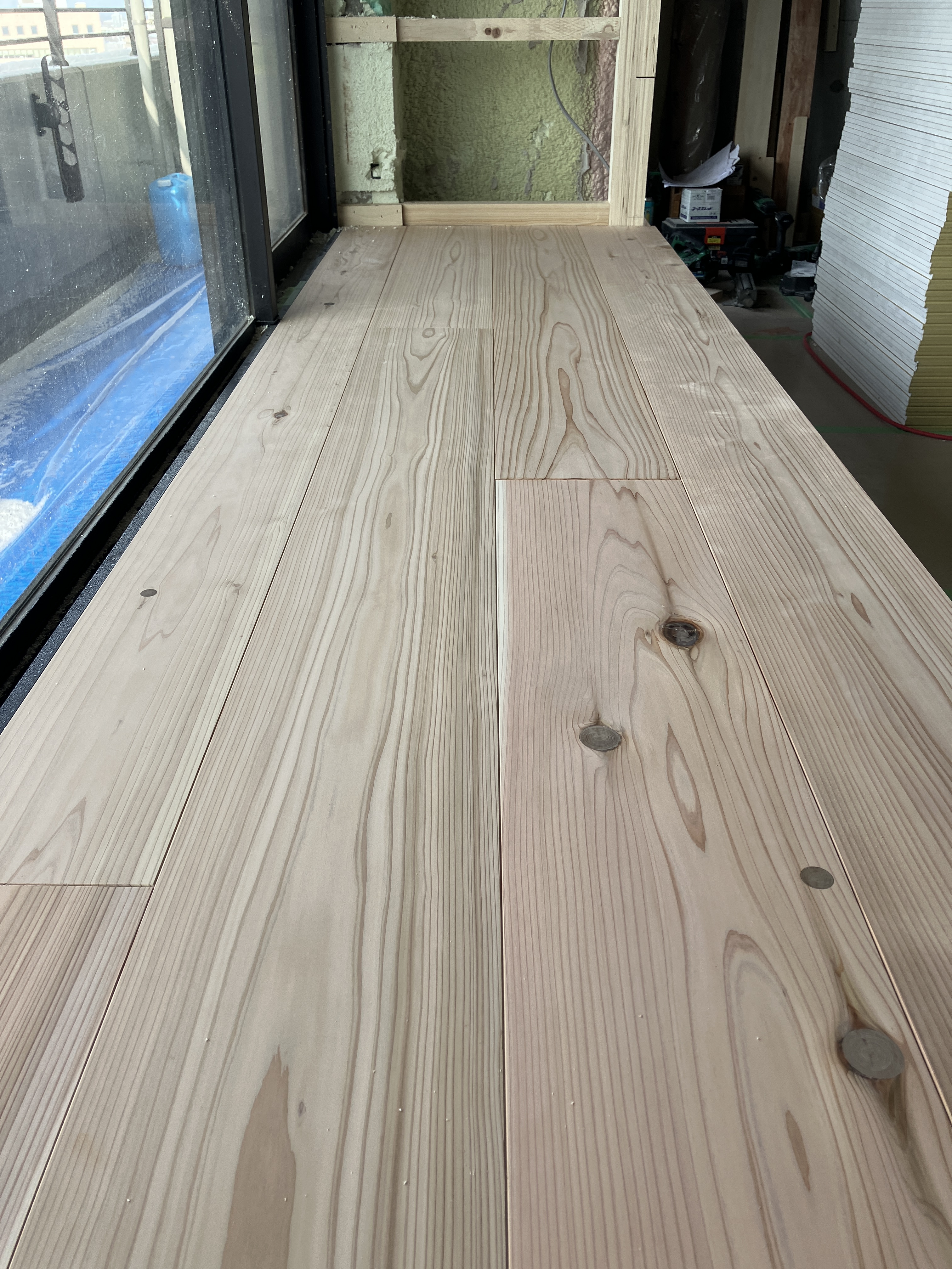 きました!!! 杉の床材です。厚さ30mm!