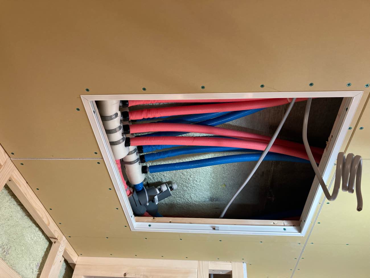 天井の給水・給湯管のヘッター部分には点検口を設置。