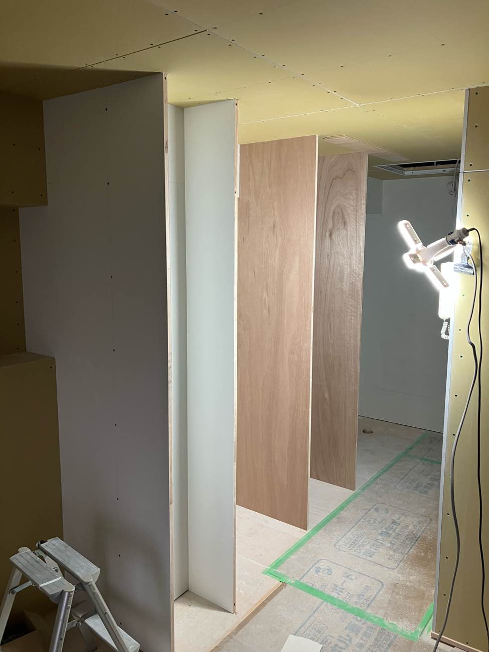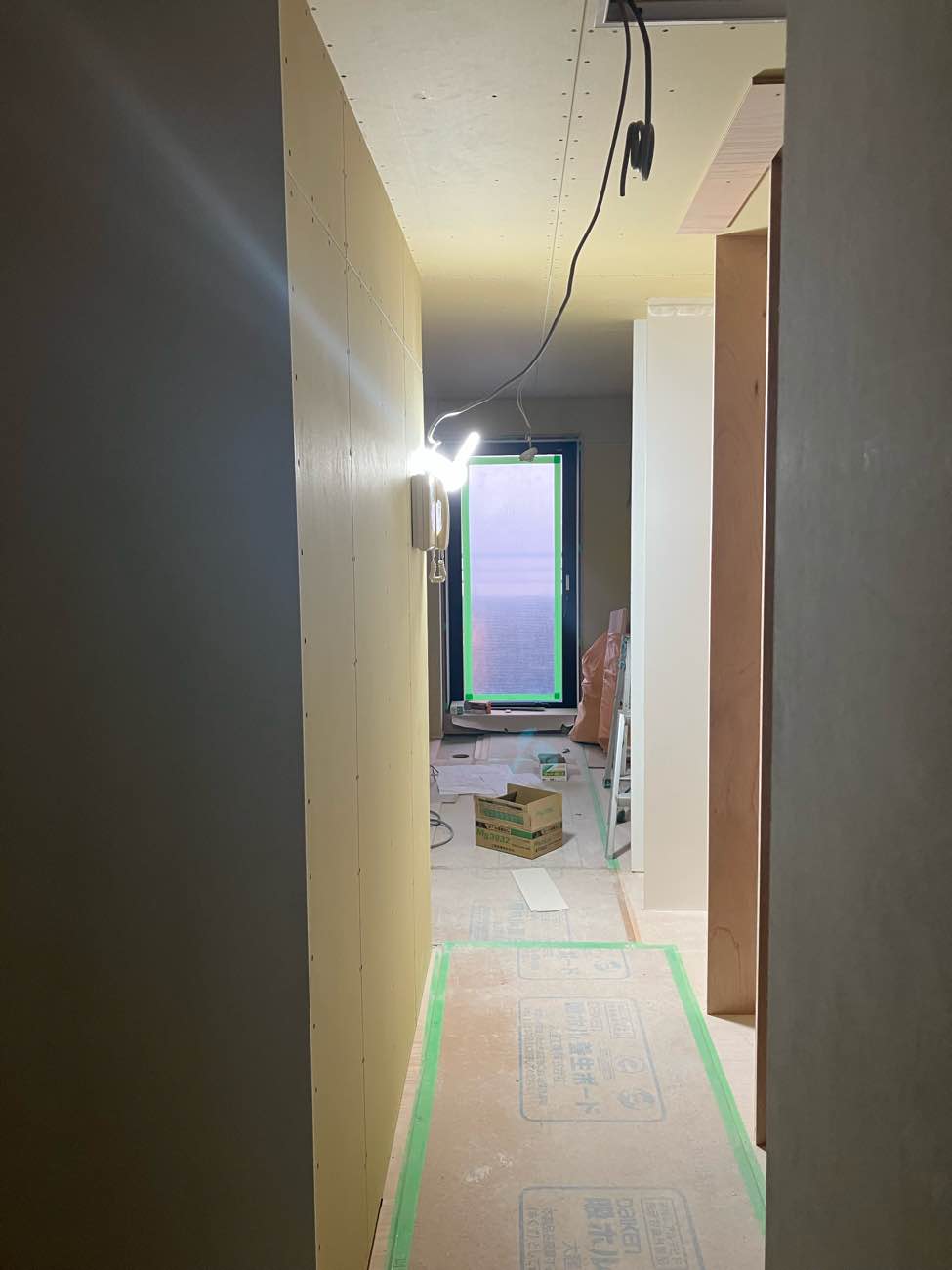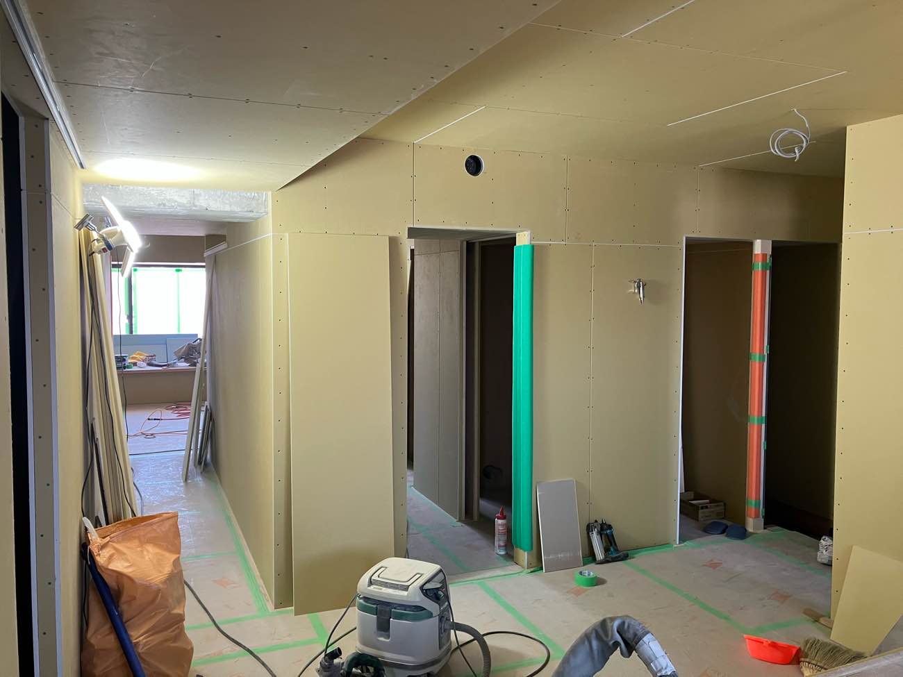 防音上開いてる隙間は、工事中の木くずやほこりが入らないようにする為です。さあ、テープ張りも終了し、次回から本格的に大工工事へと進んでいきます。