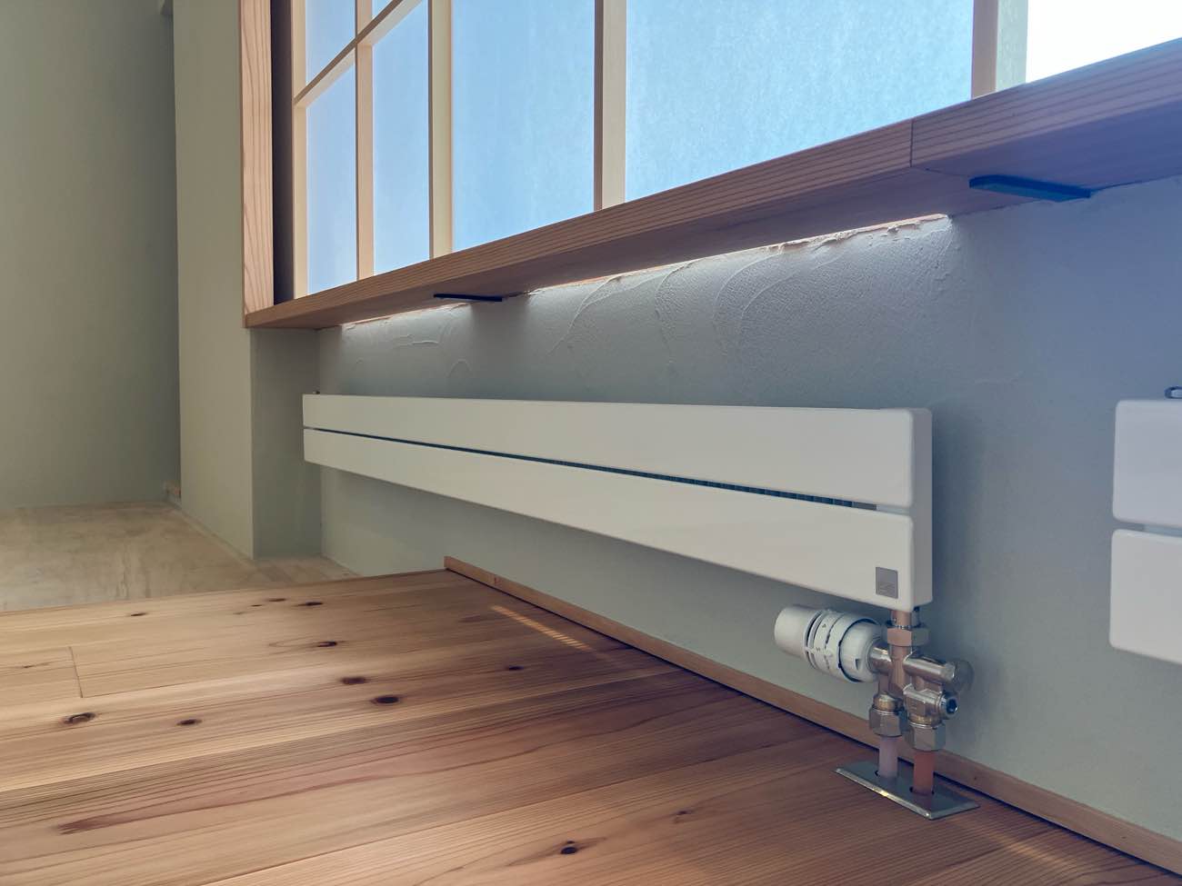 間仕切り兼用の今回初採用のECOWIN、冬はパネル暖房で夏はパネル冷房。