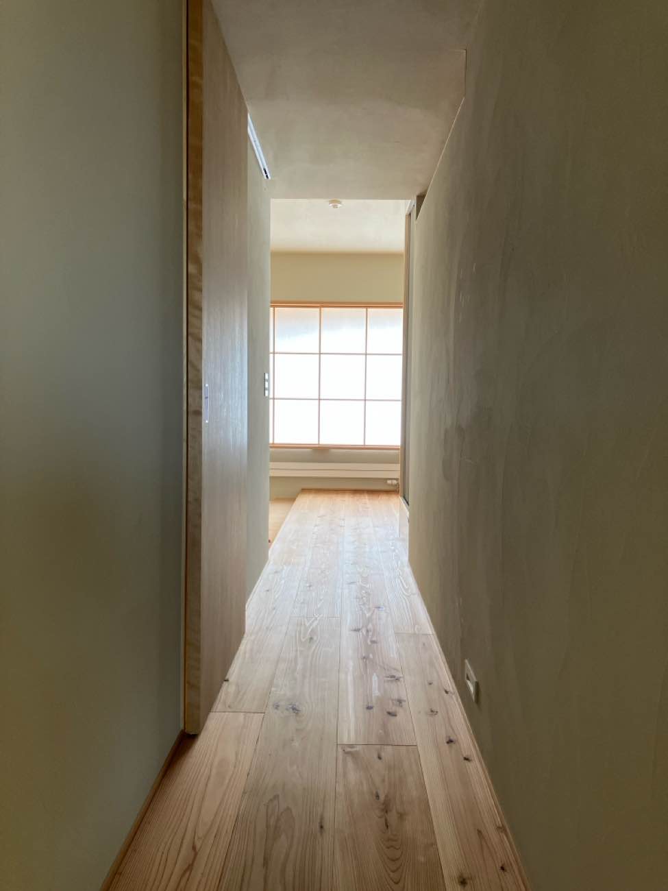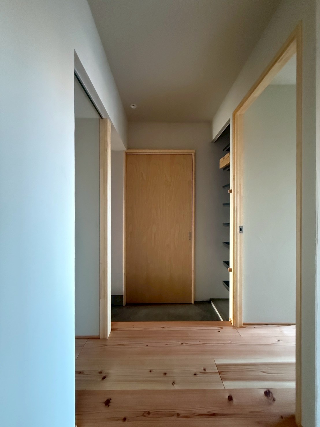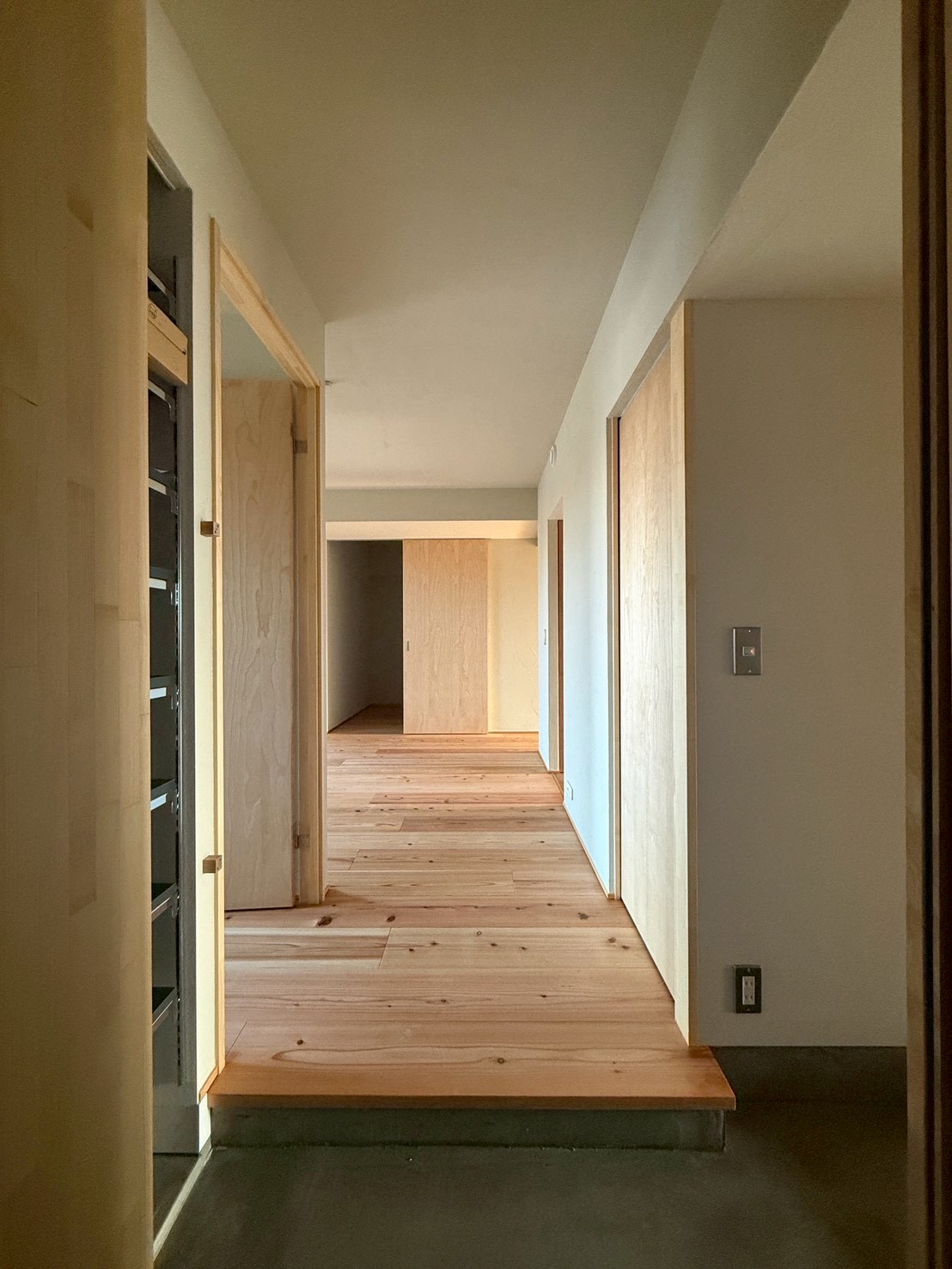 モルタル床~杉の床材が印象的ですね。ホワイトバーチ、ロータリー仕上げの造作建具も色合いが良いです!
