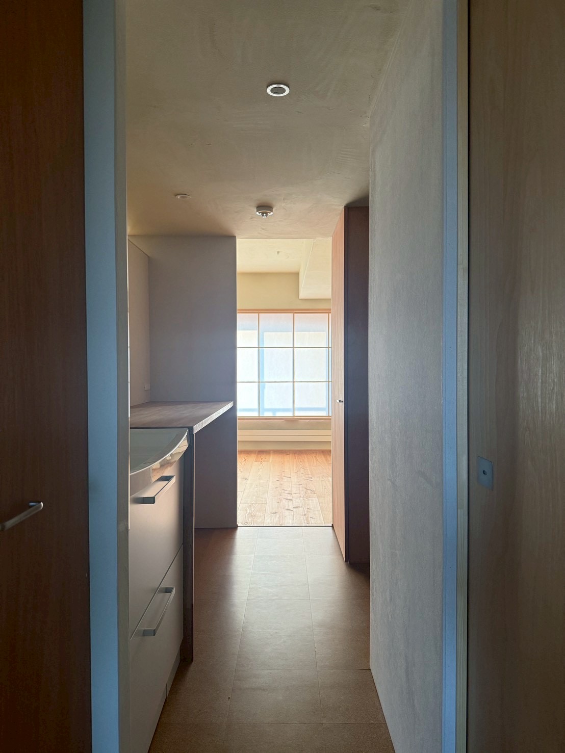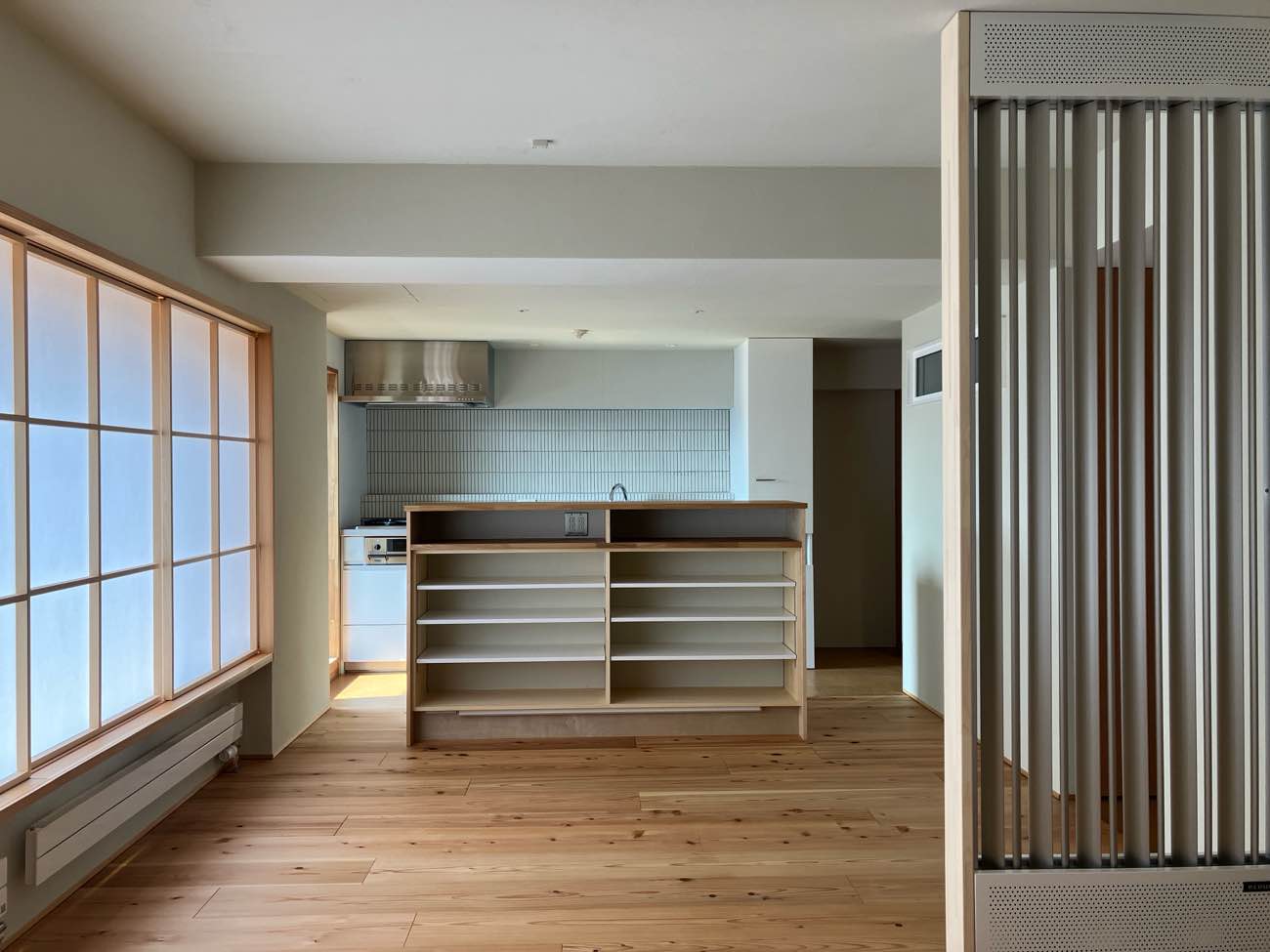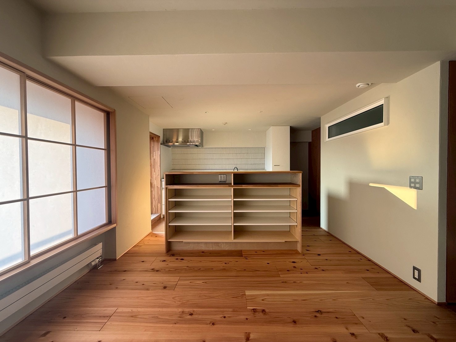 モルタル床~杉の床材が印象的ですね。ホワイトバーチ、ロータリー仕上げの造作建具も色合いが良いです!