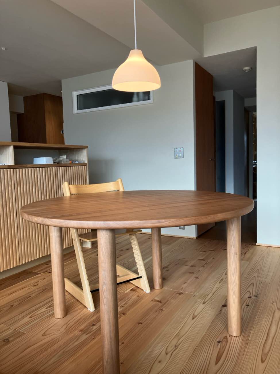 澪工房のクルミ材、直径120cm。照明器具もマッチしています。