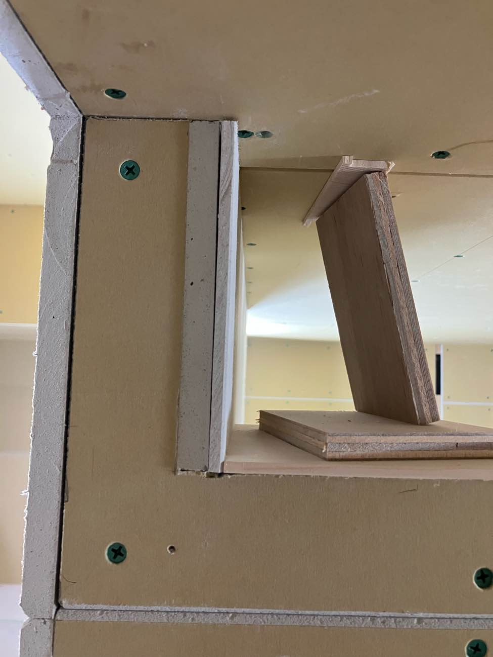 壁の中が少し見えてしまうので、シナベニヤで仕上げています。塞いでしまうと後では手が入らなく仕上げができません‥。