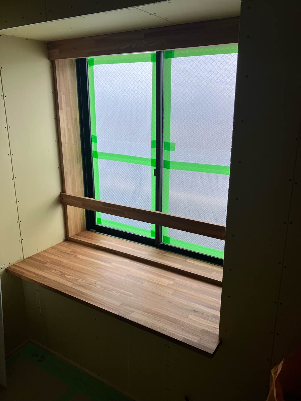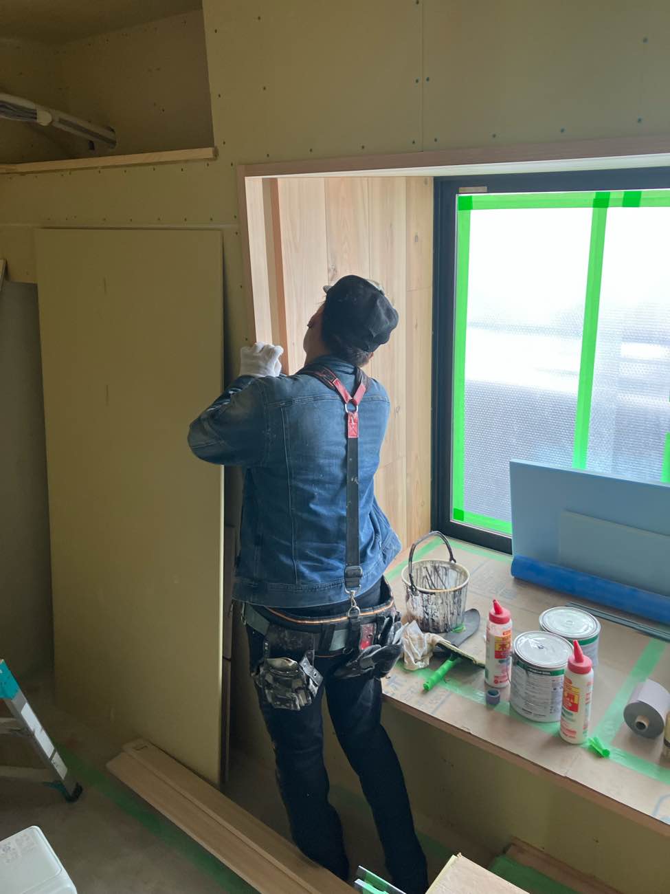 ここは洗面室壁の開口部分。笠木といわれる部分を上からビス留めではなく、ボンドで施工している為、ベニヤ板で突っ張って接着してます。