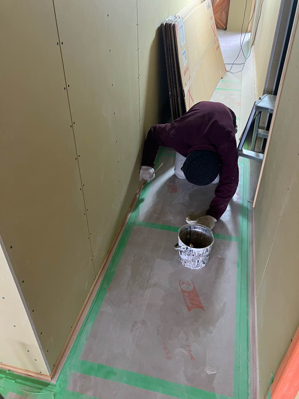床の下地が終ったら速やかに隙間にテープを張ります。