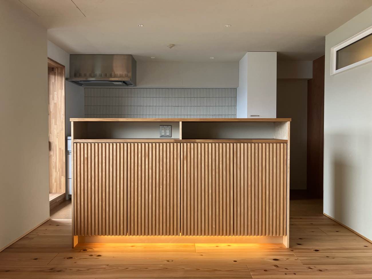 ムク材を造作扉に施工しダイニング空間のアクセントとしています。