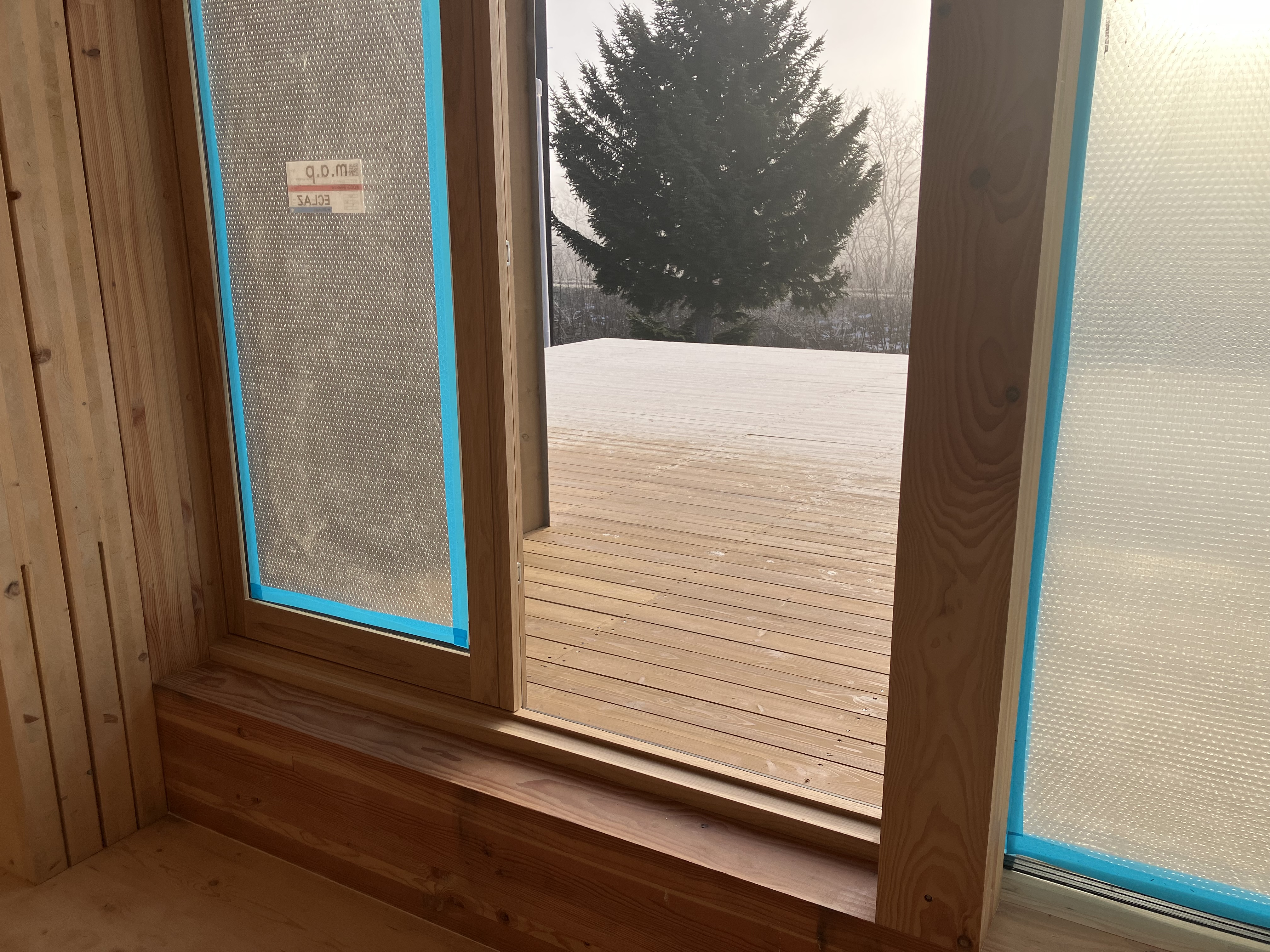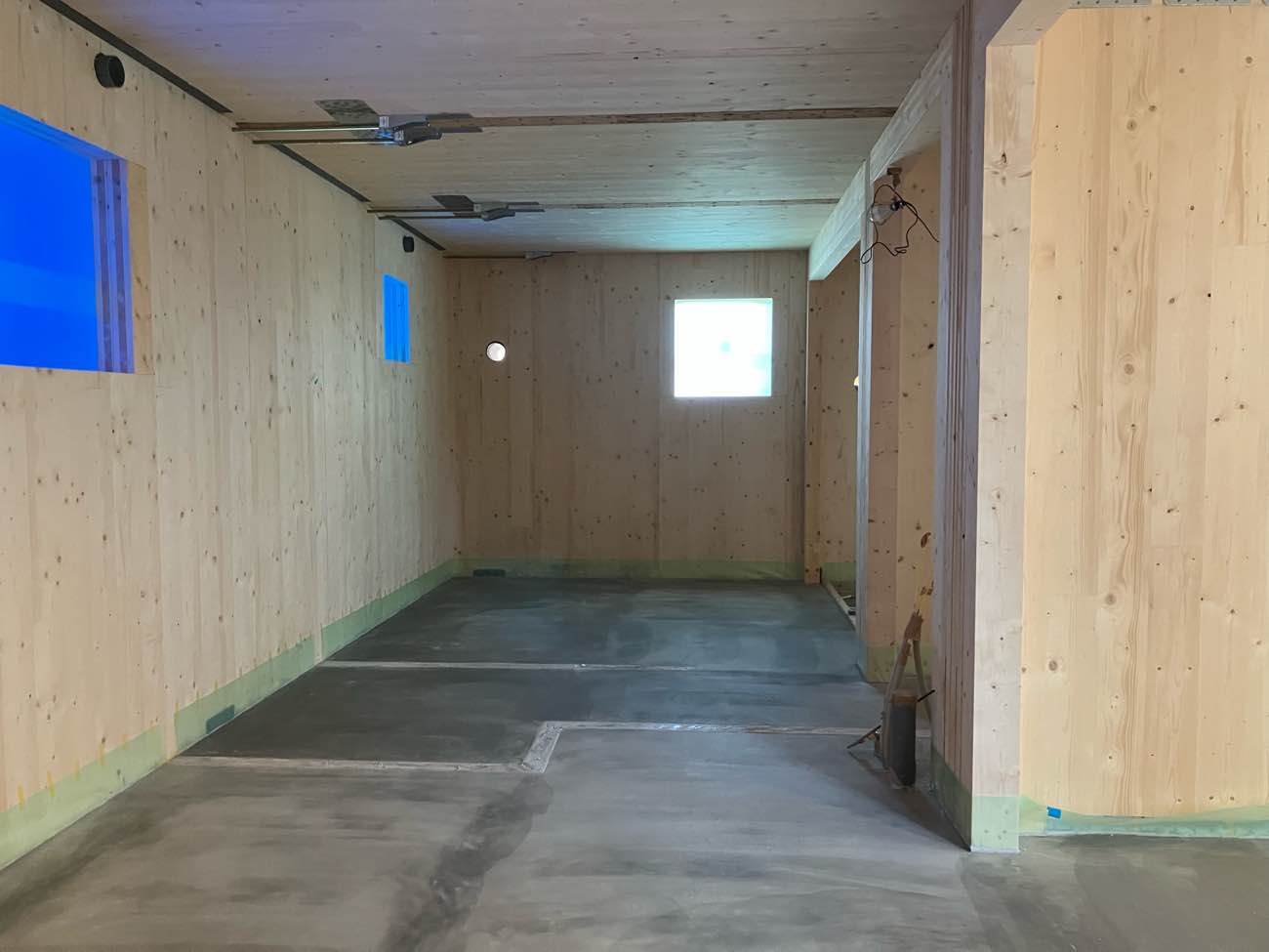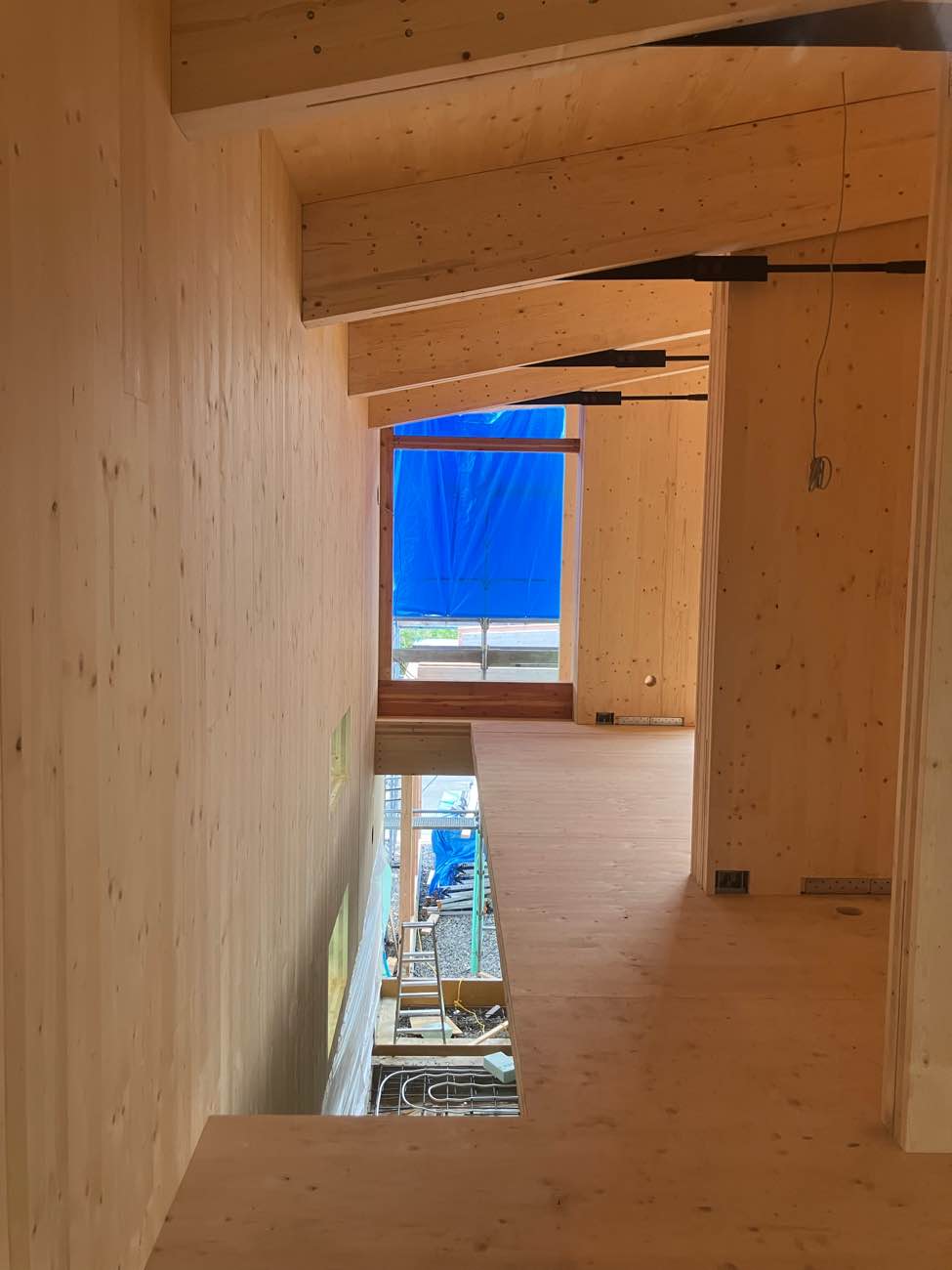 フローリング仕上げが一般的な住宅と違い、今回はCLTの分厚い木材1層のみで2階の床ができています。そうすると懸念されるのが「2階の床から1階に伝わる騒音」なんです “(-“”-)”