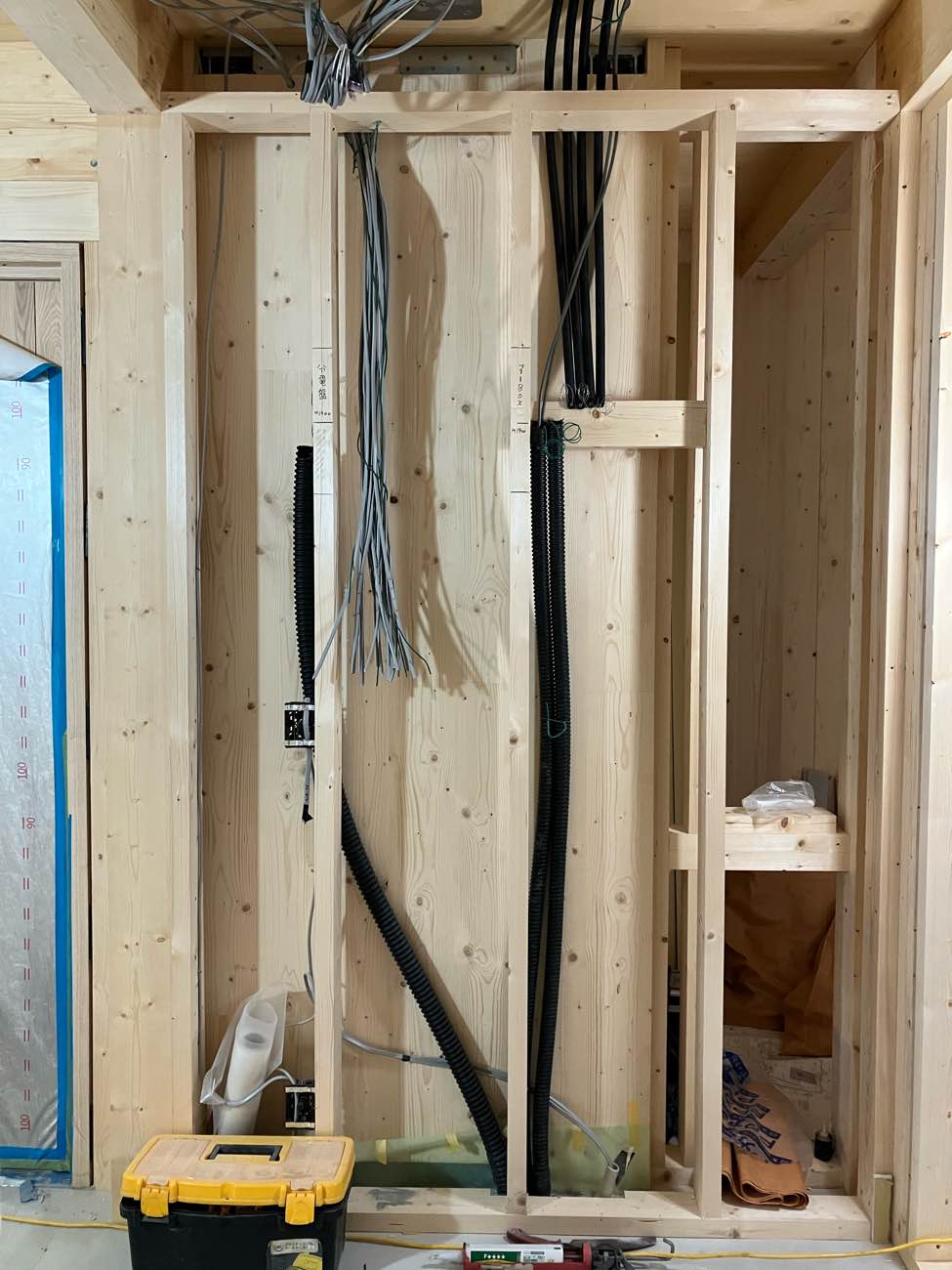 コンセントや電気のスイッチなど、大工さんに壁を塞がれる前に正しい位置に配線や電気の箱を取り付けていきます。