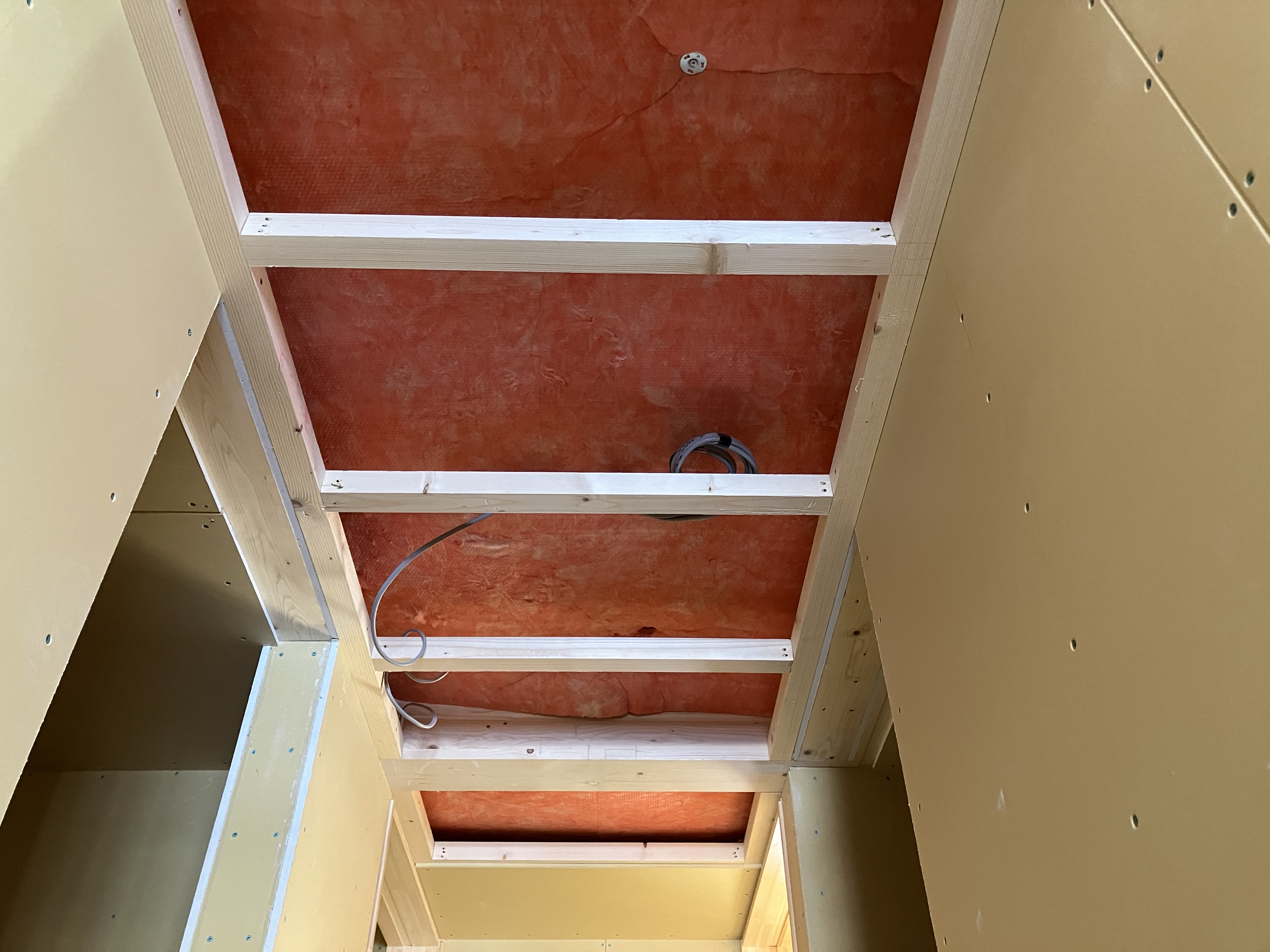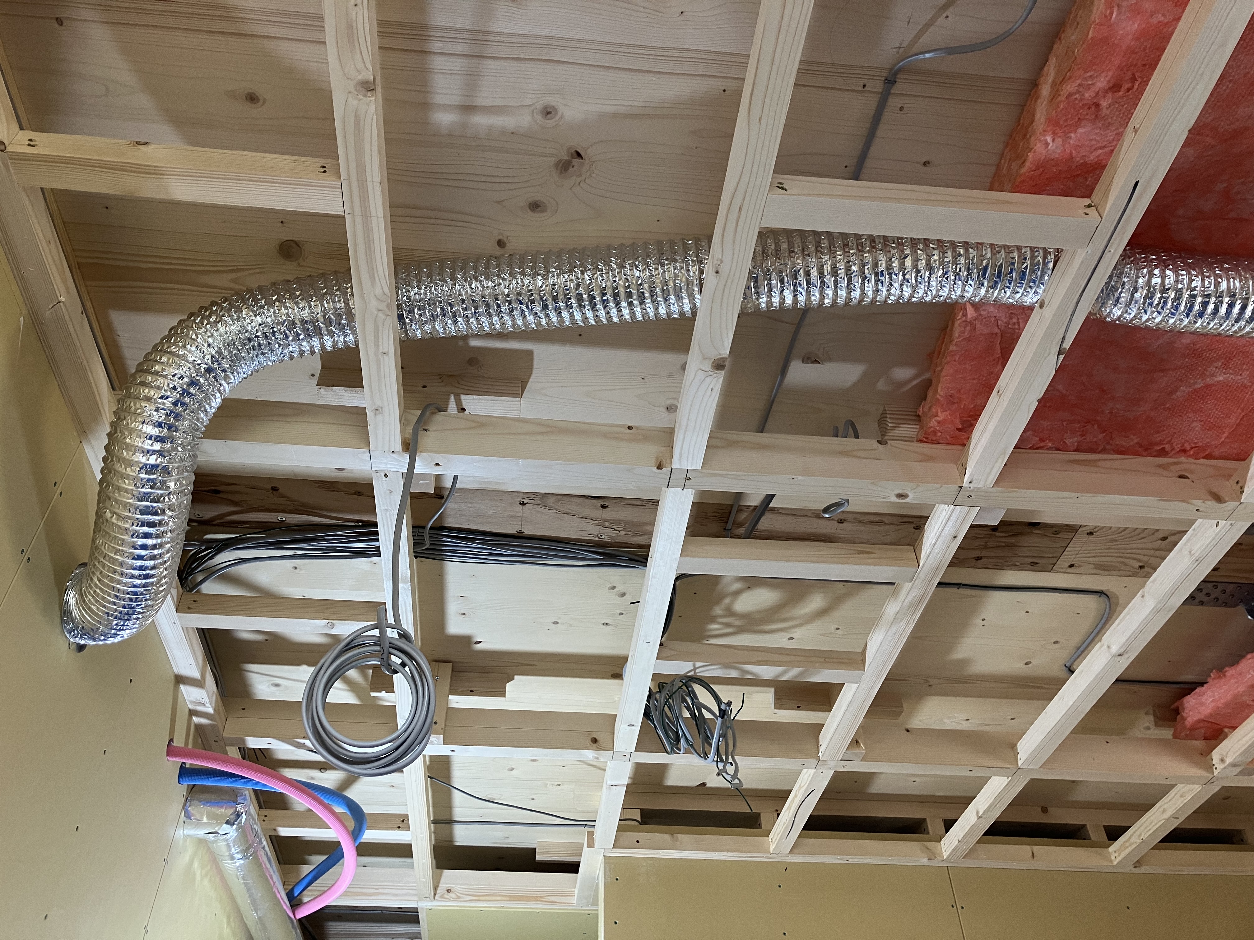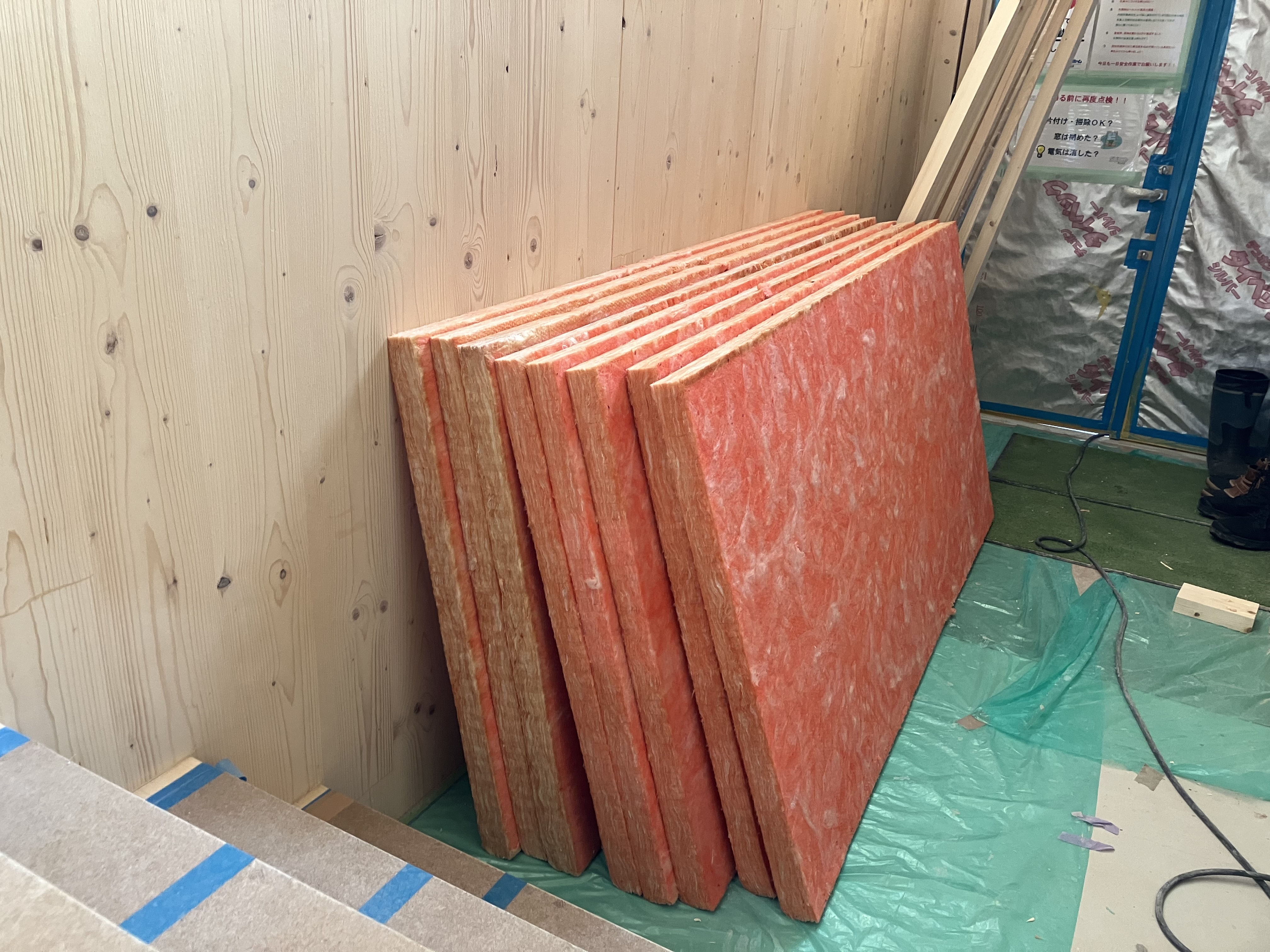 一般的な住宅ではこの手順があまりないのですが、今回なぜ天井にもグラスウールが詰められているかというと…いつもの住宅と今回のmokkaiの違いとしては2階の床。