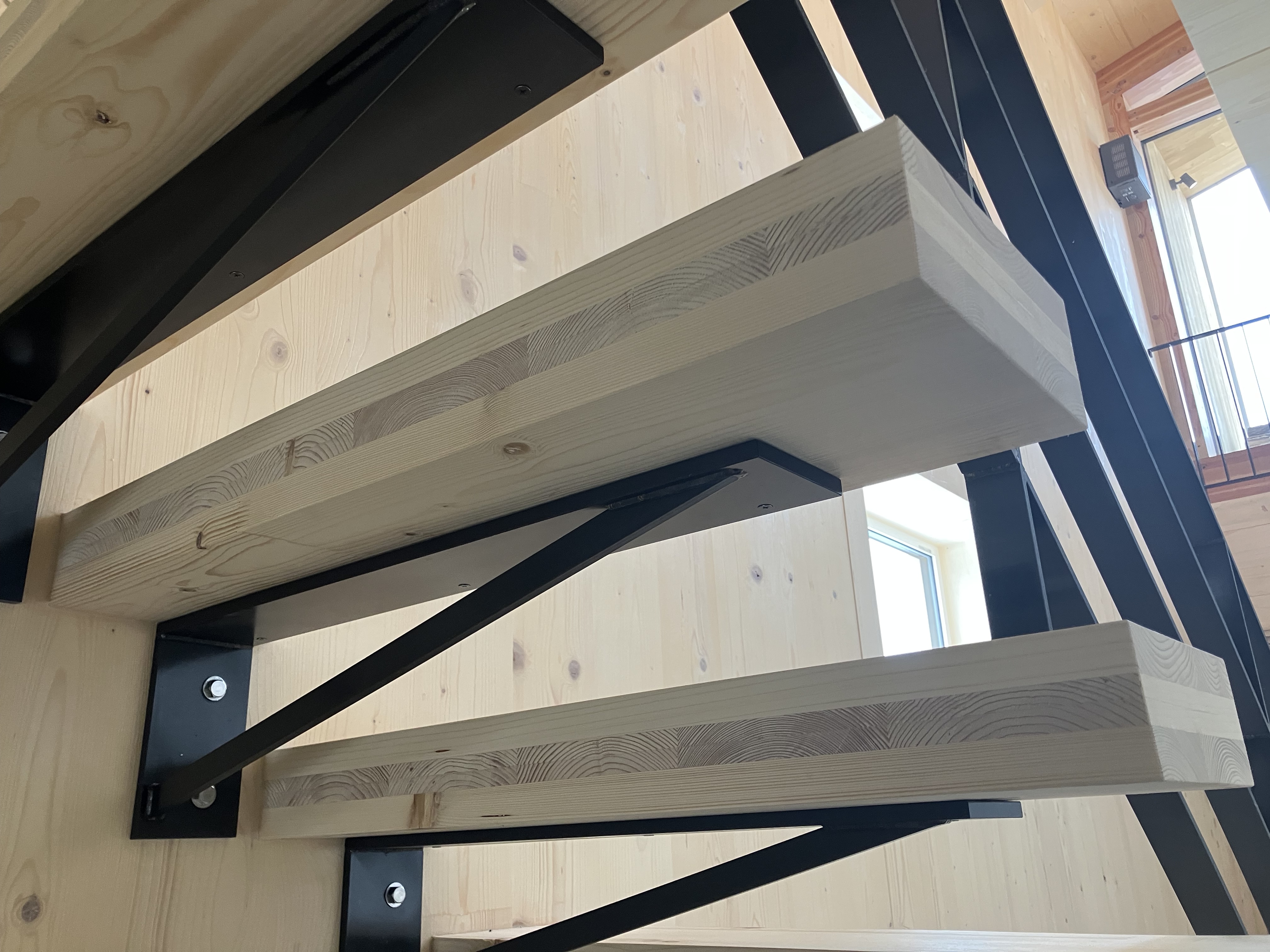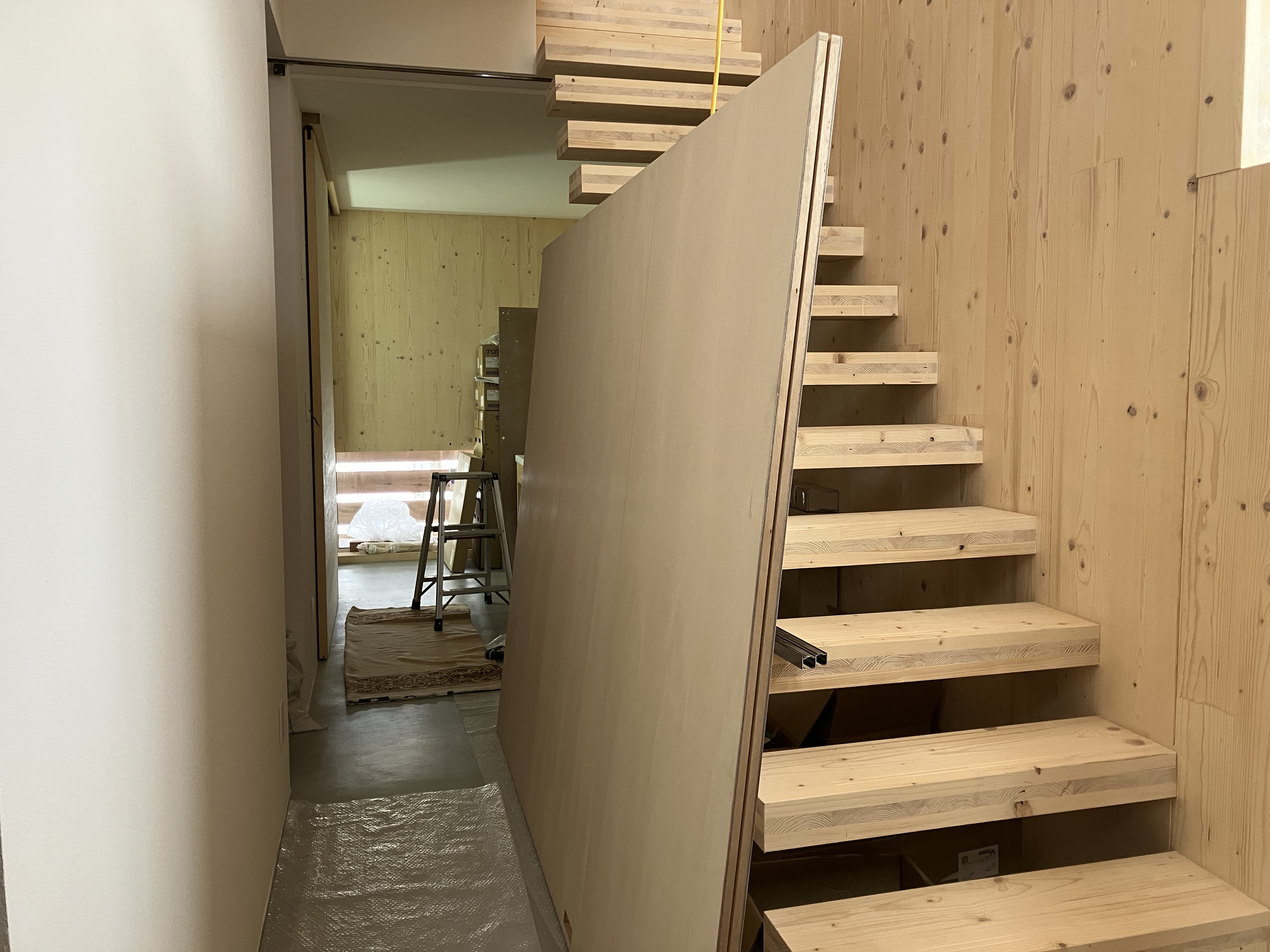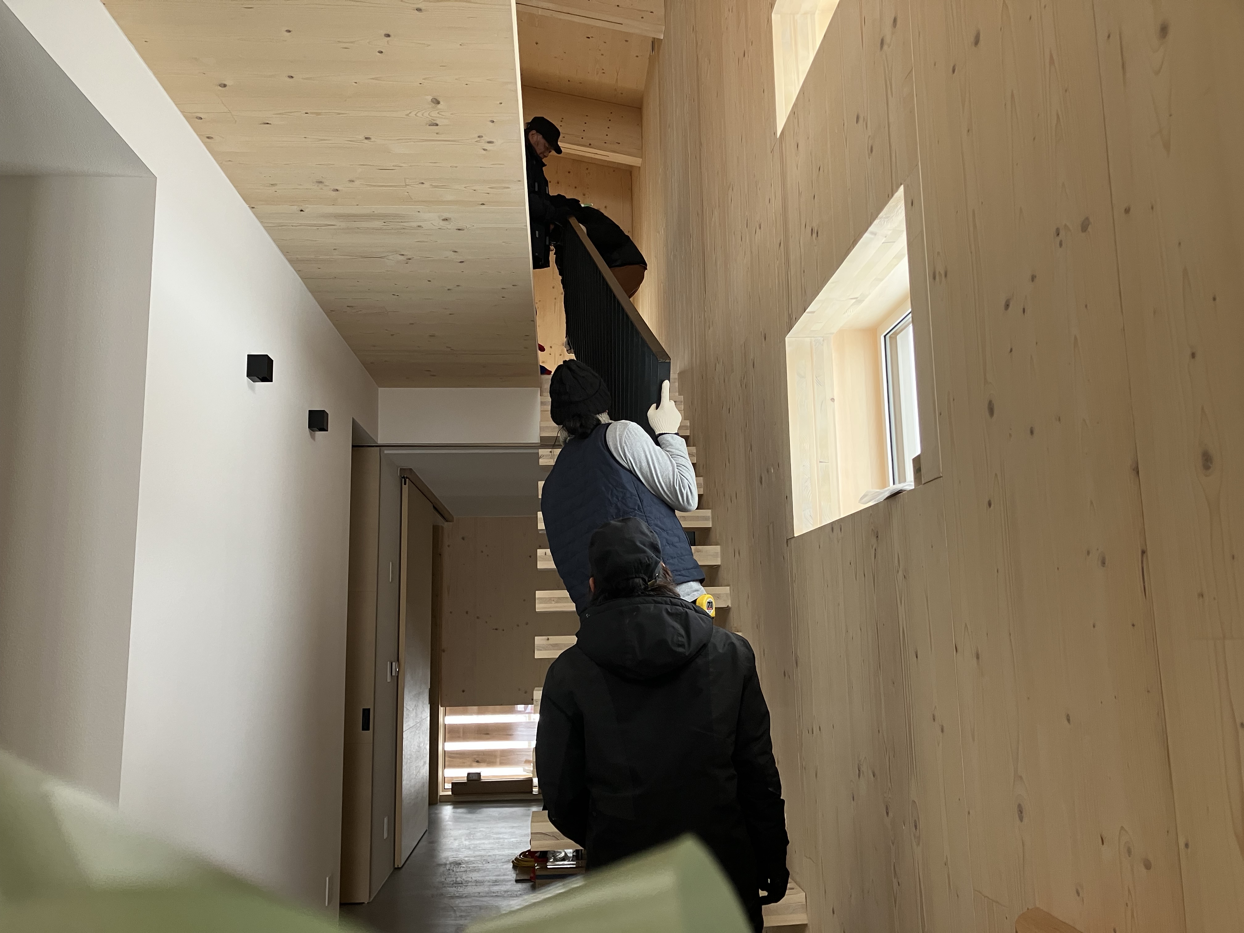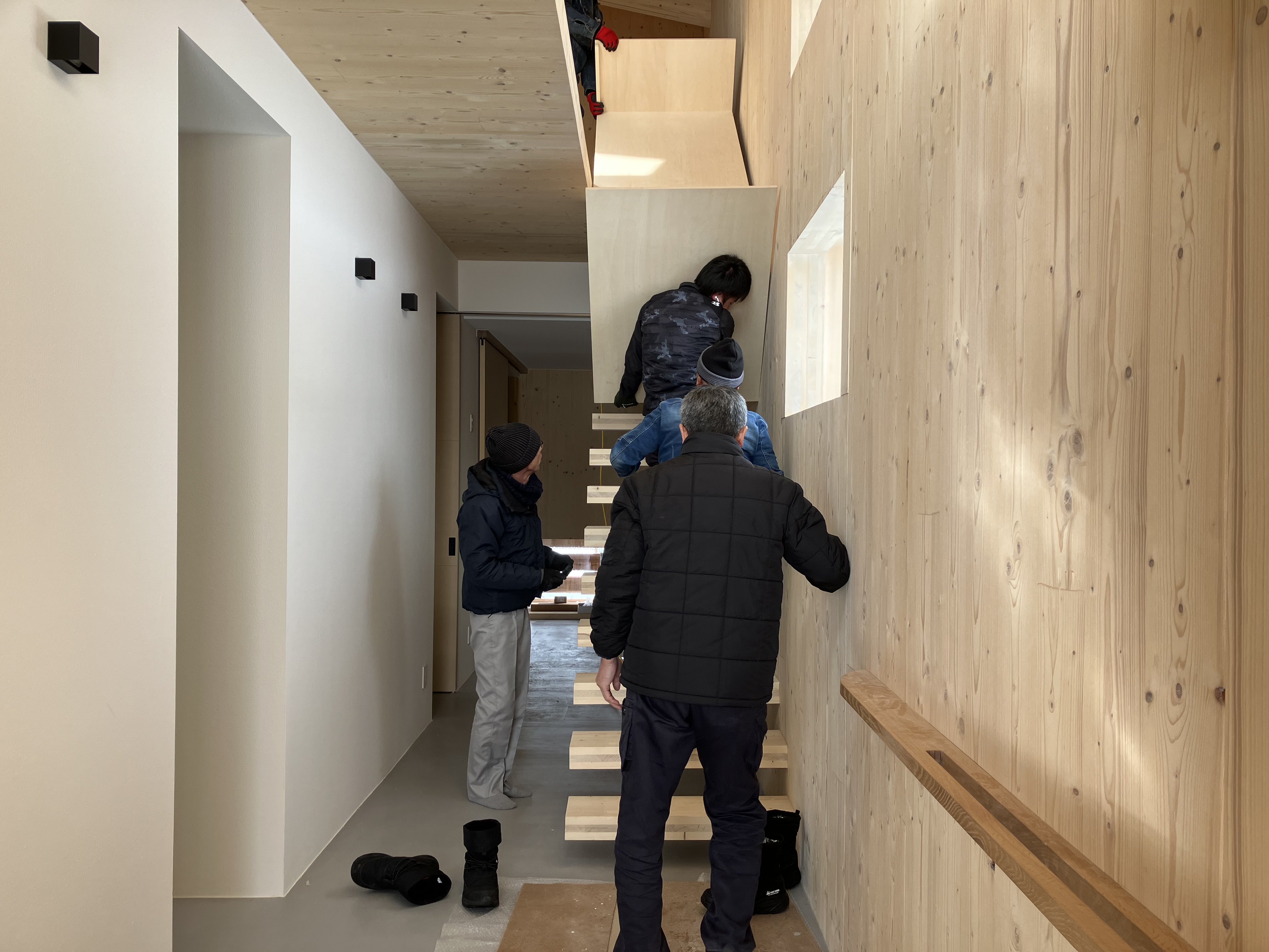 (職人さんを応援するのも汗をかく大変なお仕事です!)手摺は設置されましたが、階段の段板は片持ち状態で、このままだと少し心もとないので、、、