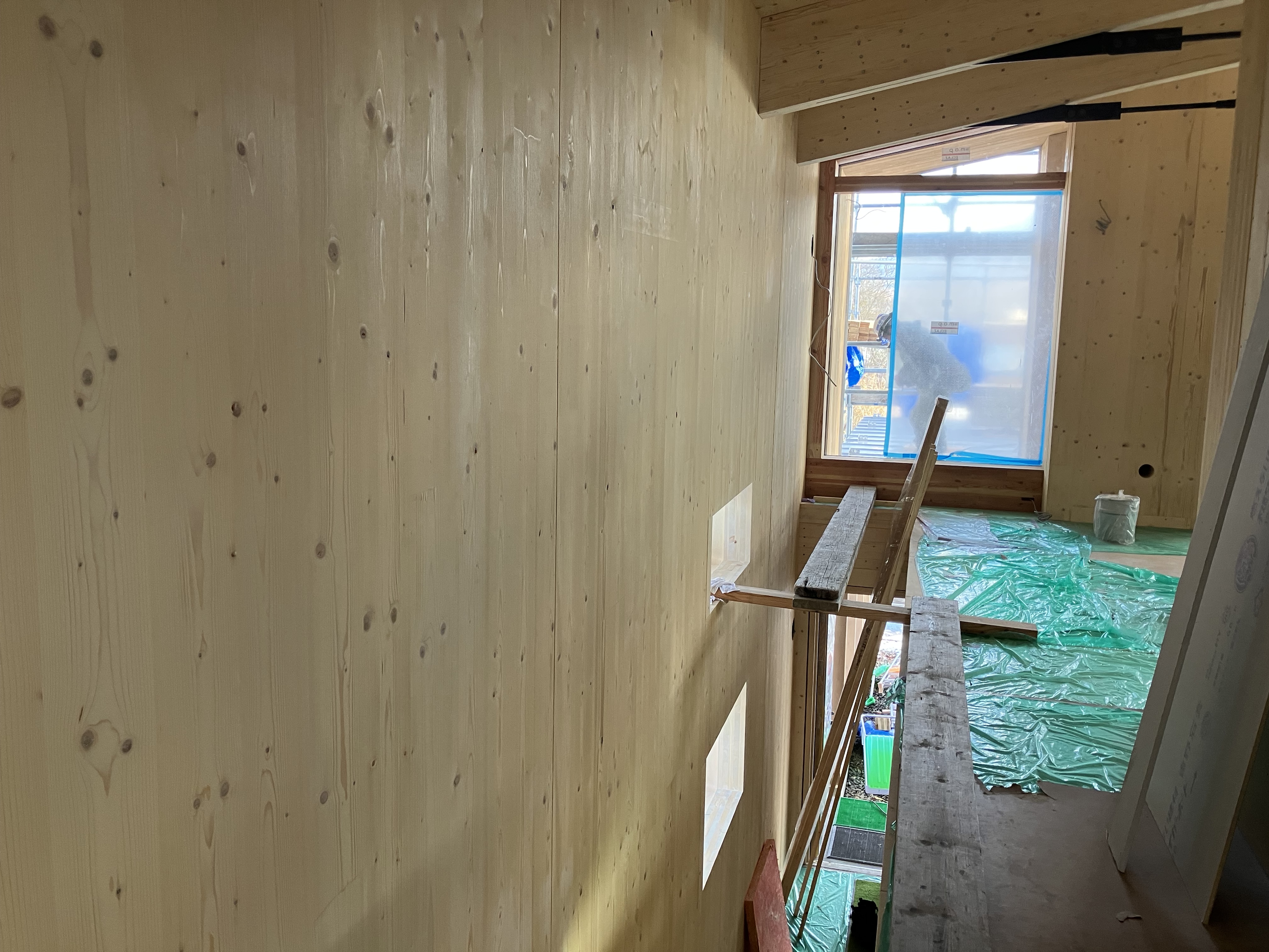 今回CLTの木が見えている部分はそのまま仕上げになると、しつこいくらい言っていますが、もちろん何もしないわけではありません。