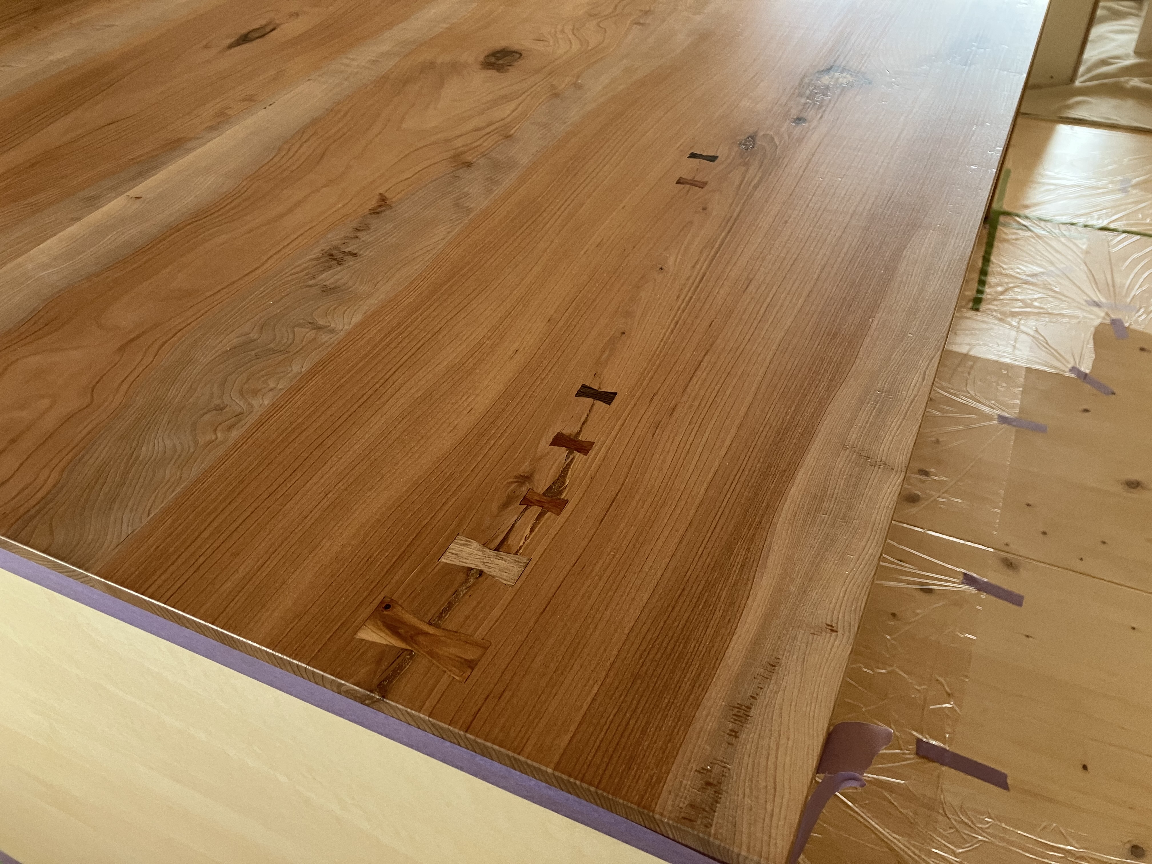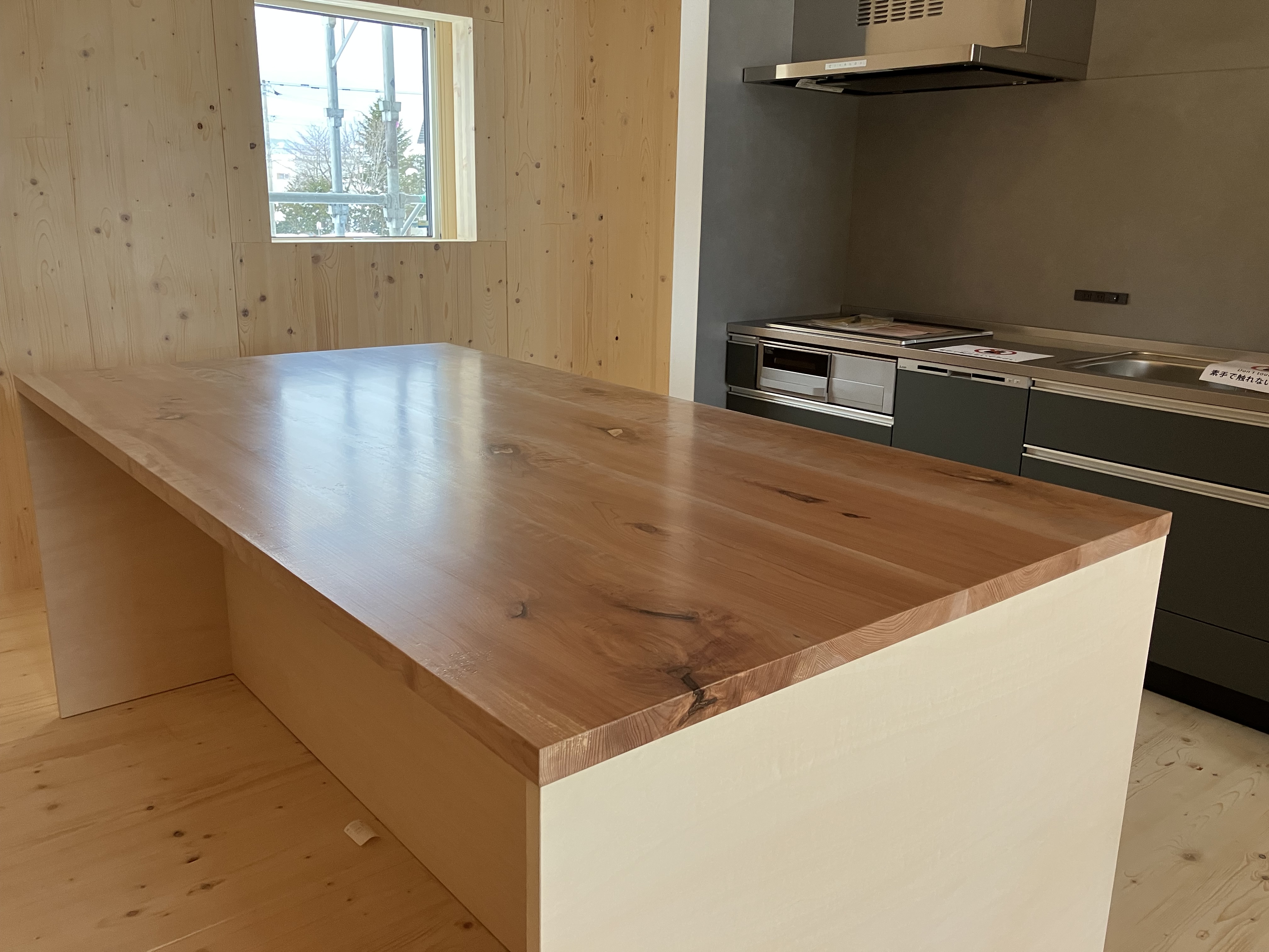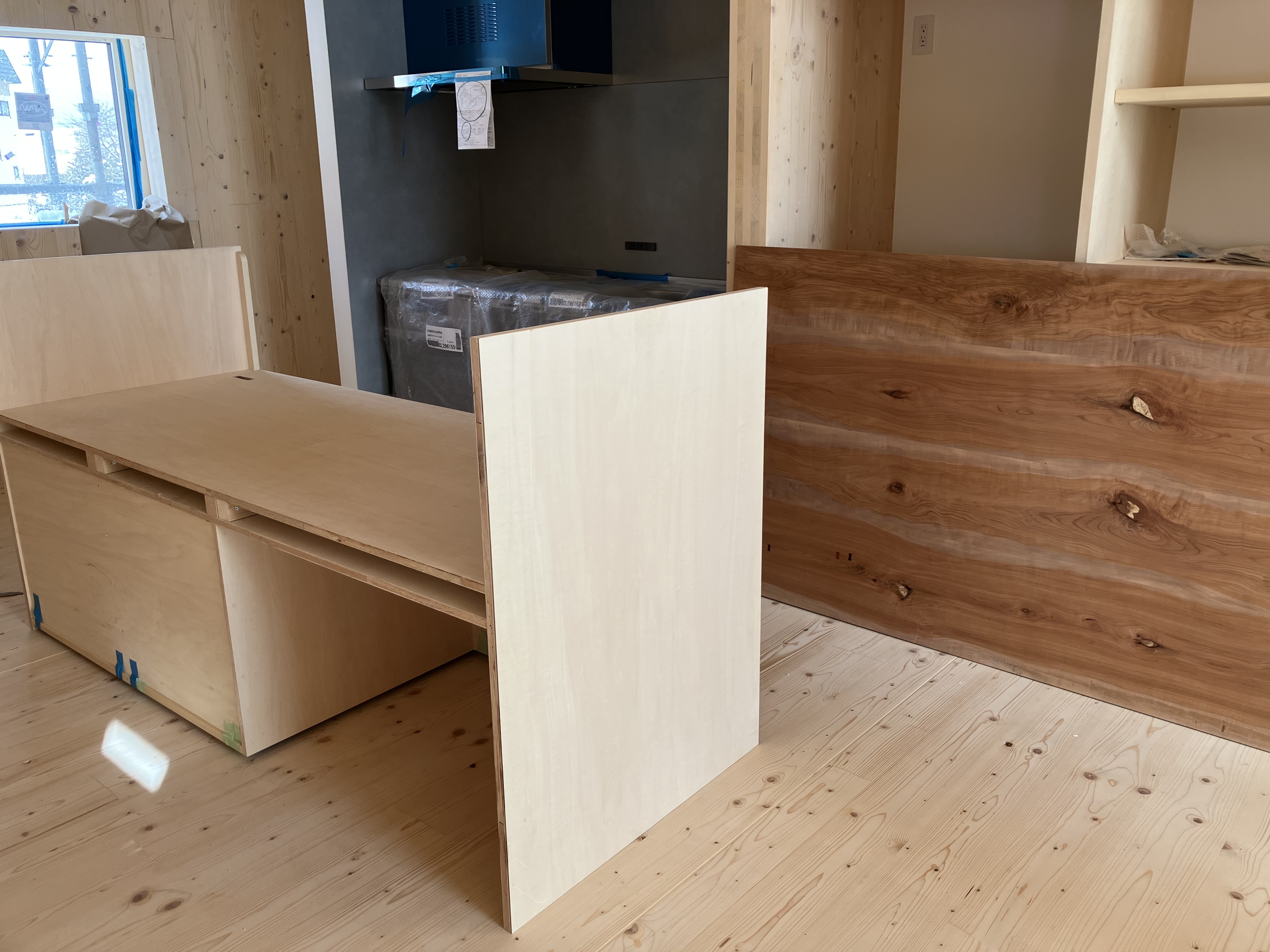 現地にお越しの際は、ぜひ家具にも注目してみてください (*´▽`*)仕上げ作業がひと段落すると、床や窓を覆って傷から保護していた養生材が剥がされるのですが、