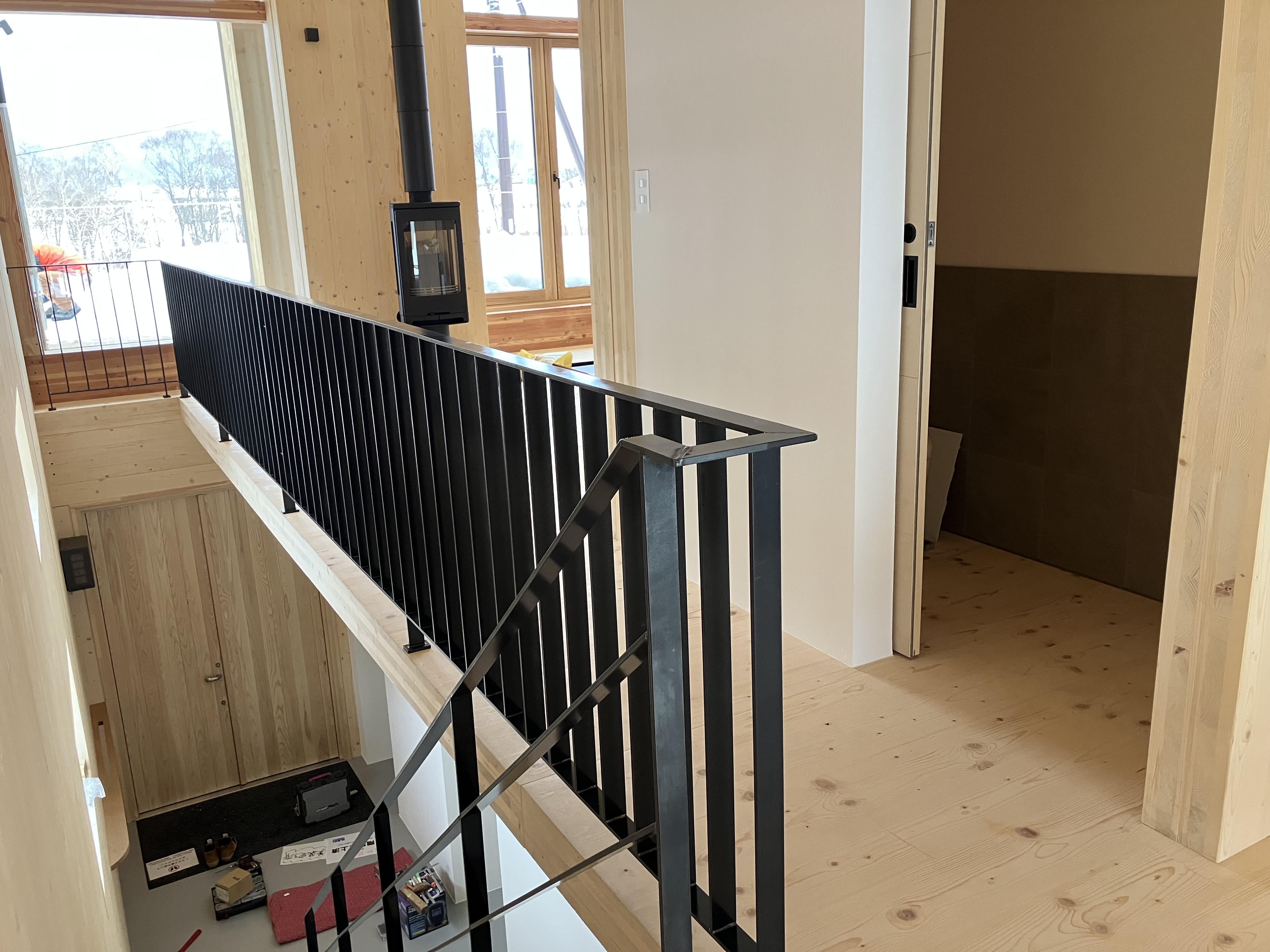 階段は玄関入ってすぐの場所にあるので、冬場は雪のついたコートをぶら下げておけると便利かなぁ、、という意図でこんな感じにしてみました (‘ω’)ノそして外にはバルコニーがありますので、そこにも手摺を設置してもらいます。