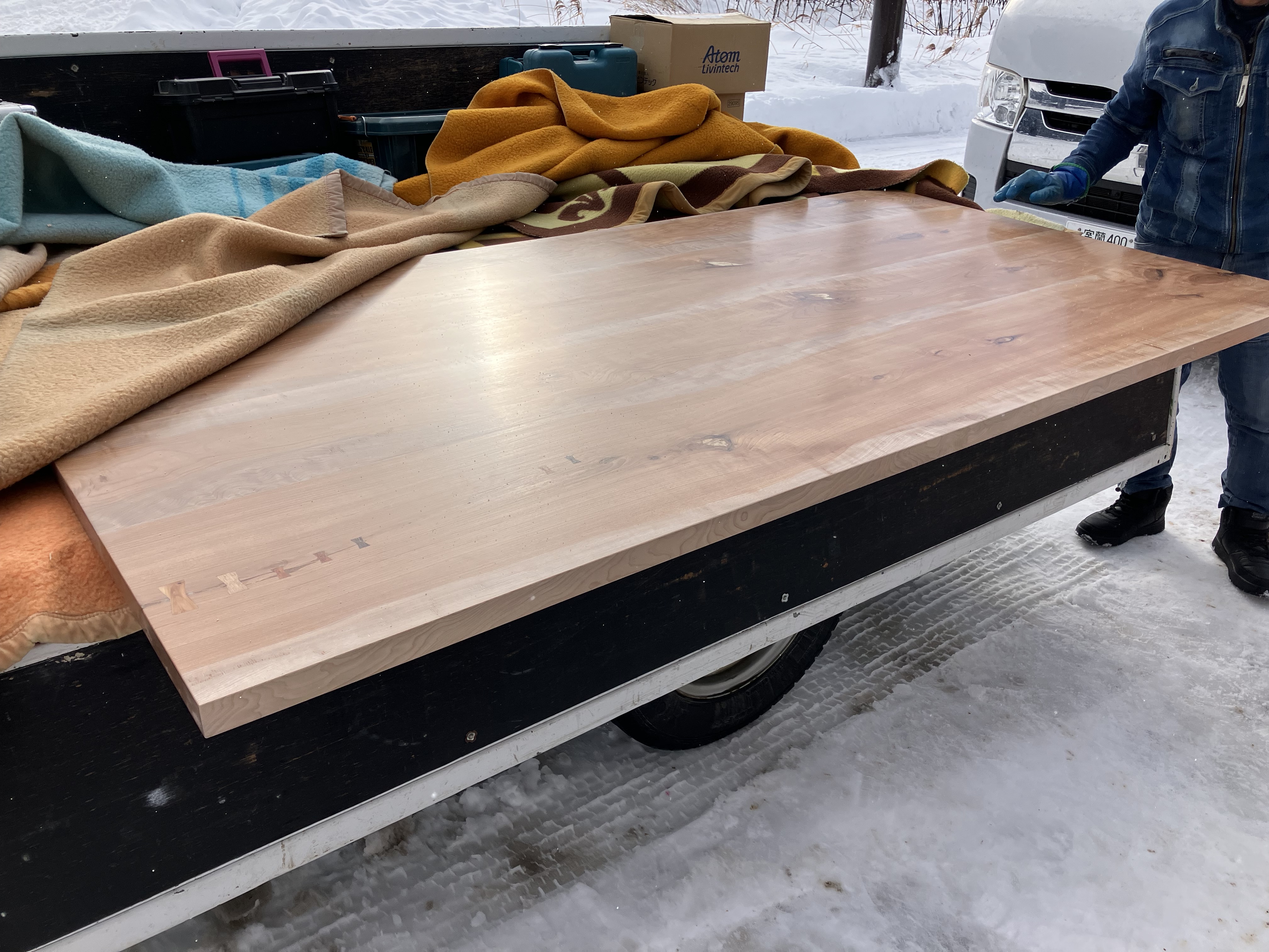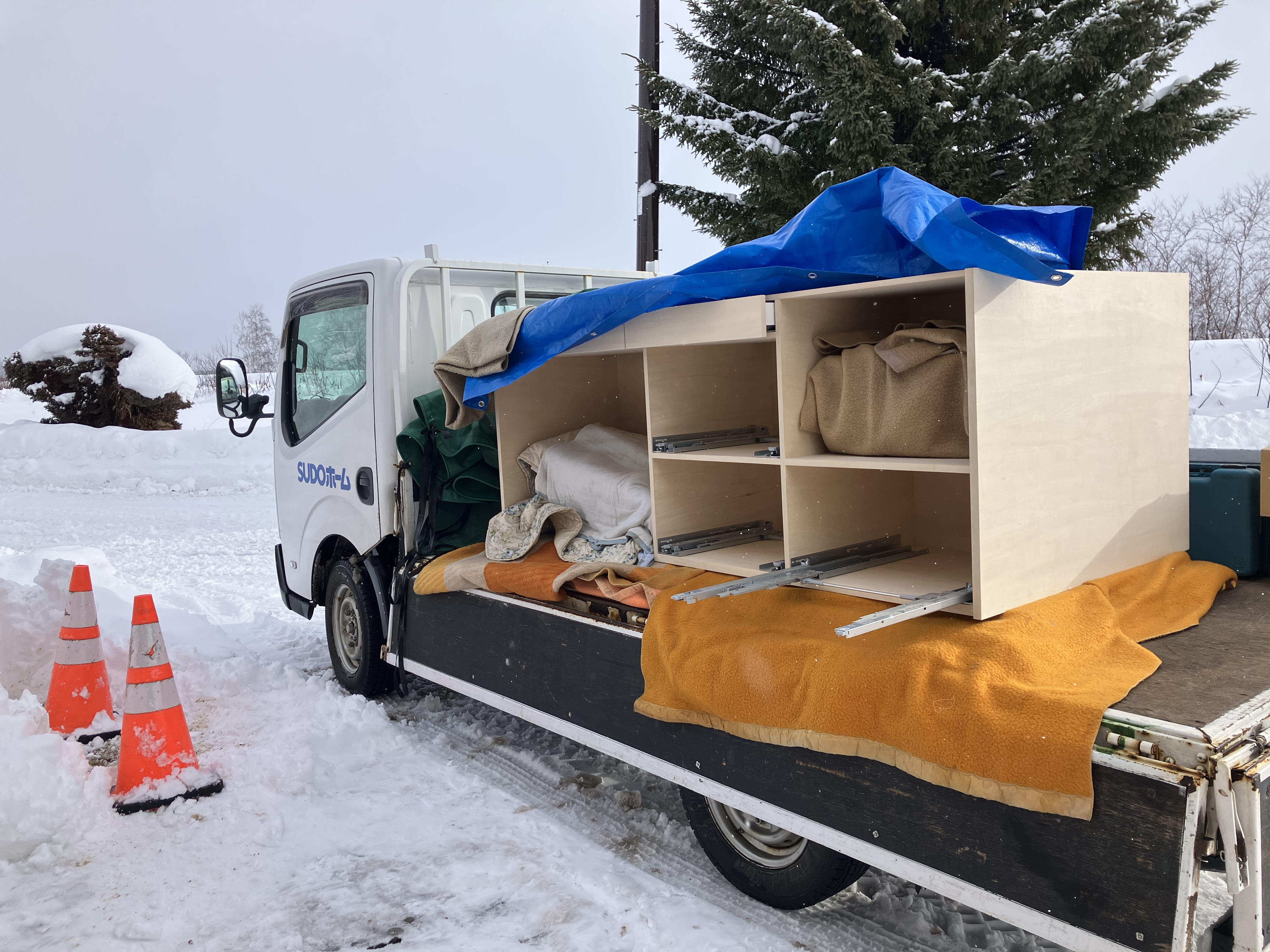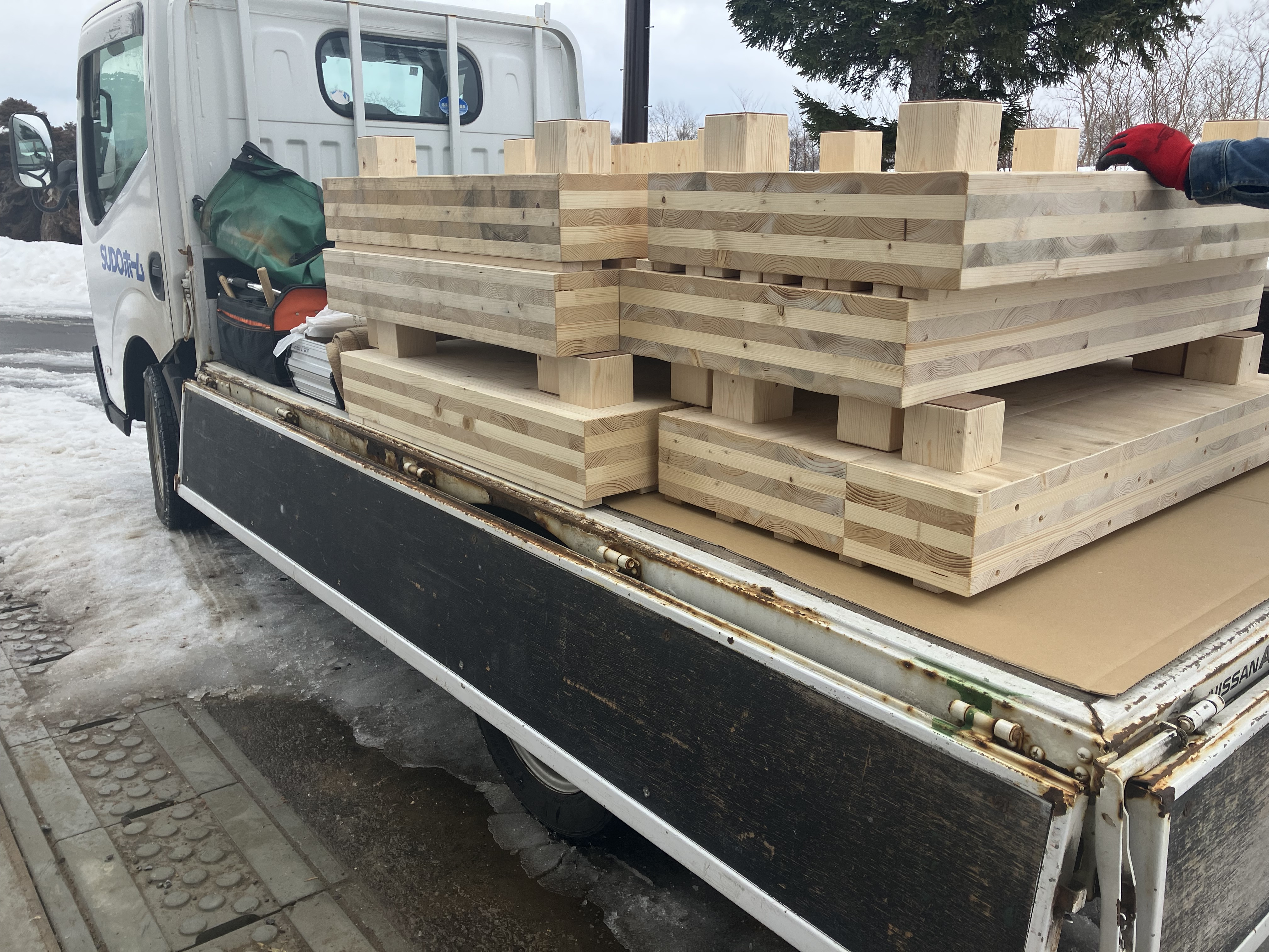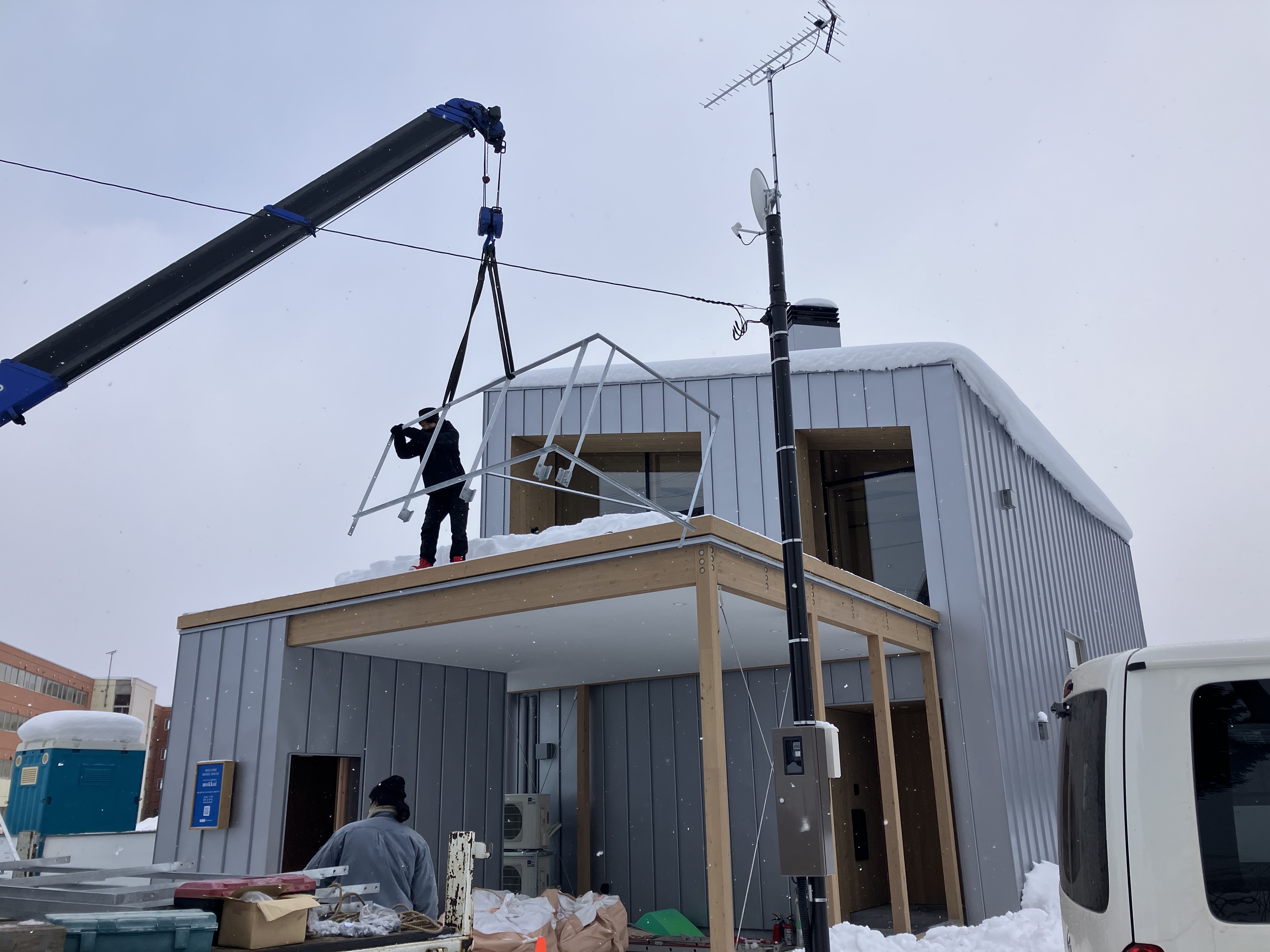 雪が降る中、建具チームが新たに現場に運んできたものは…