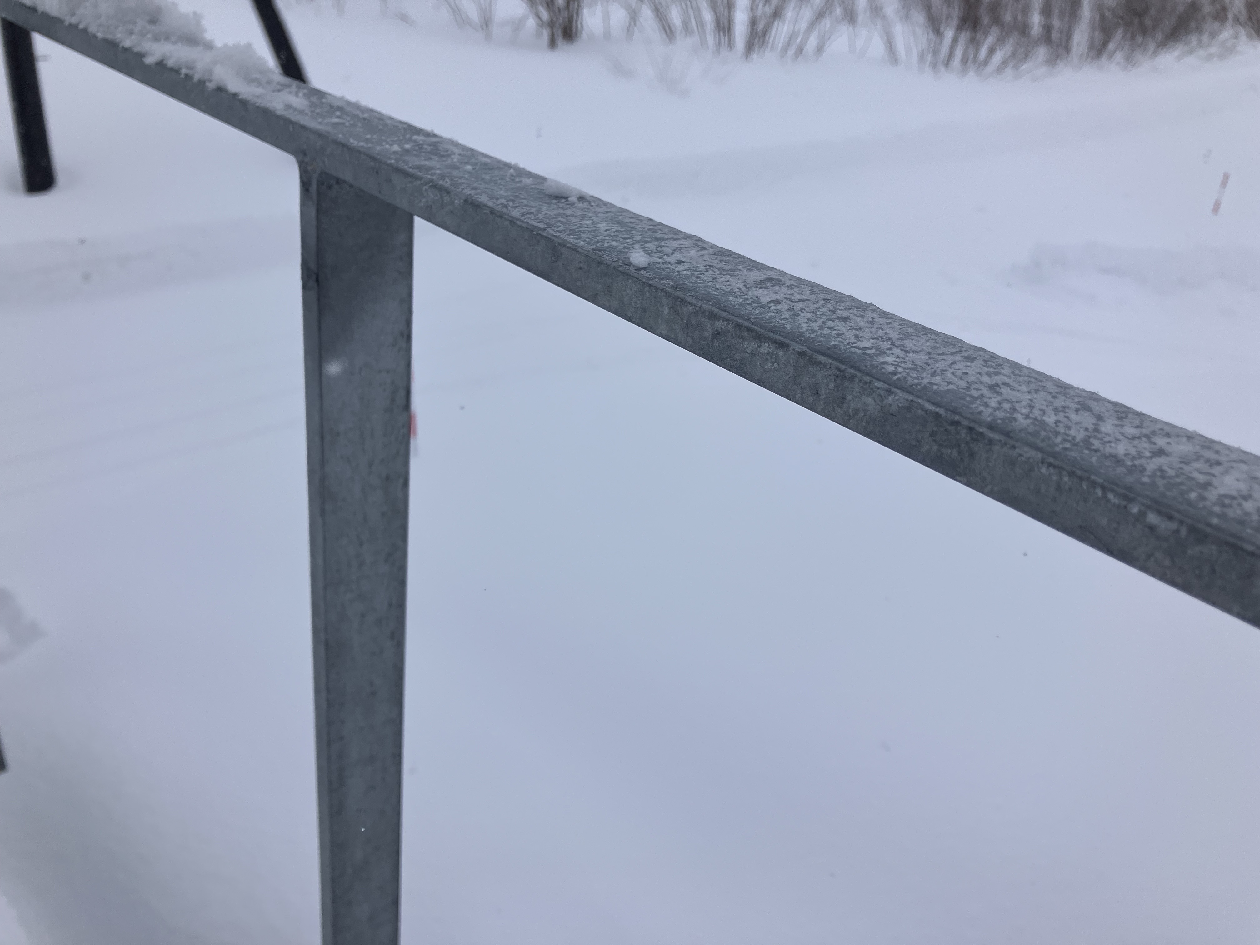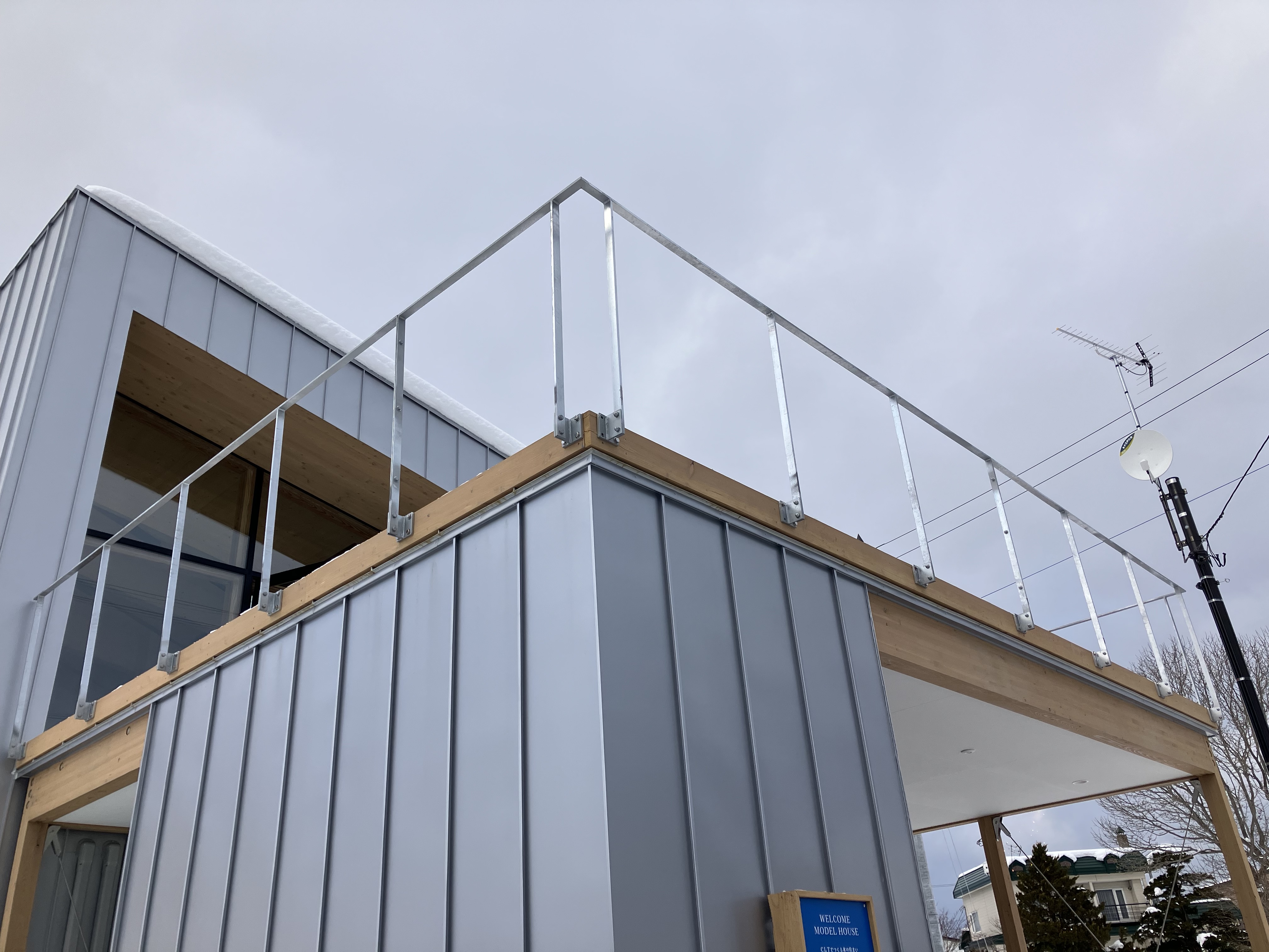 外部に取り付けたのは、板金色に合わせてシルバーの手摺です。外部の手摺は、溶融亜鉛メッキという加工で仕上げているのですが、どのようなものかというと…