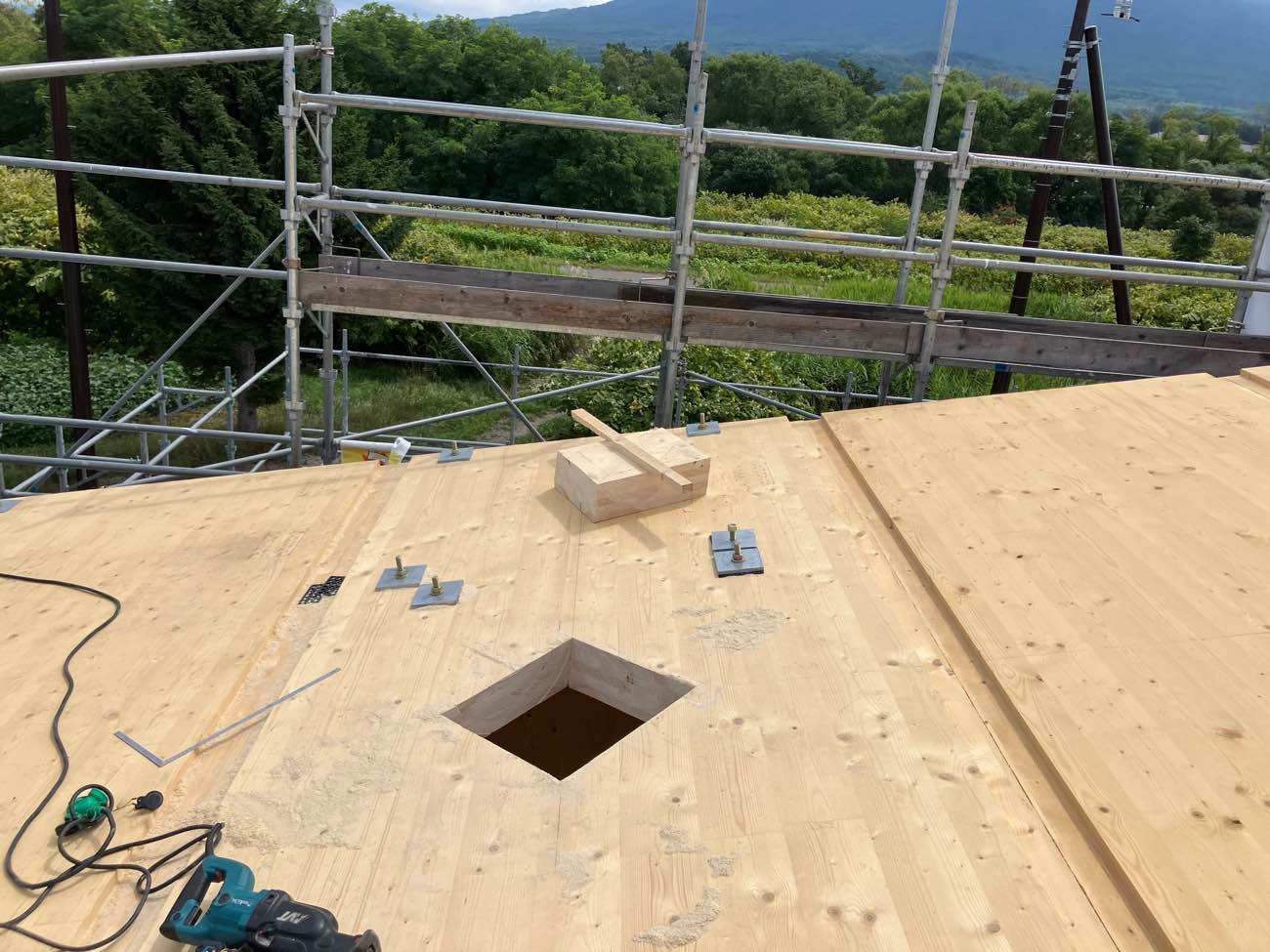 2階に薪ストーブが設置され煙突がありますので、その為の規定位置に開口作業をしている所でした。