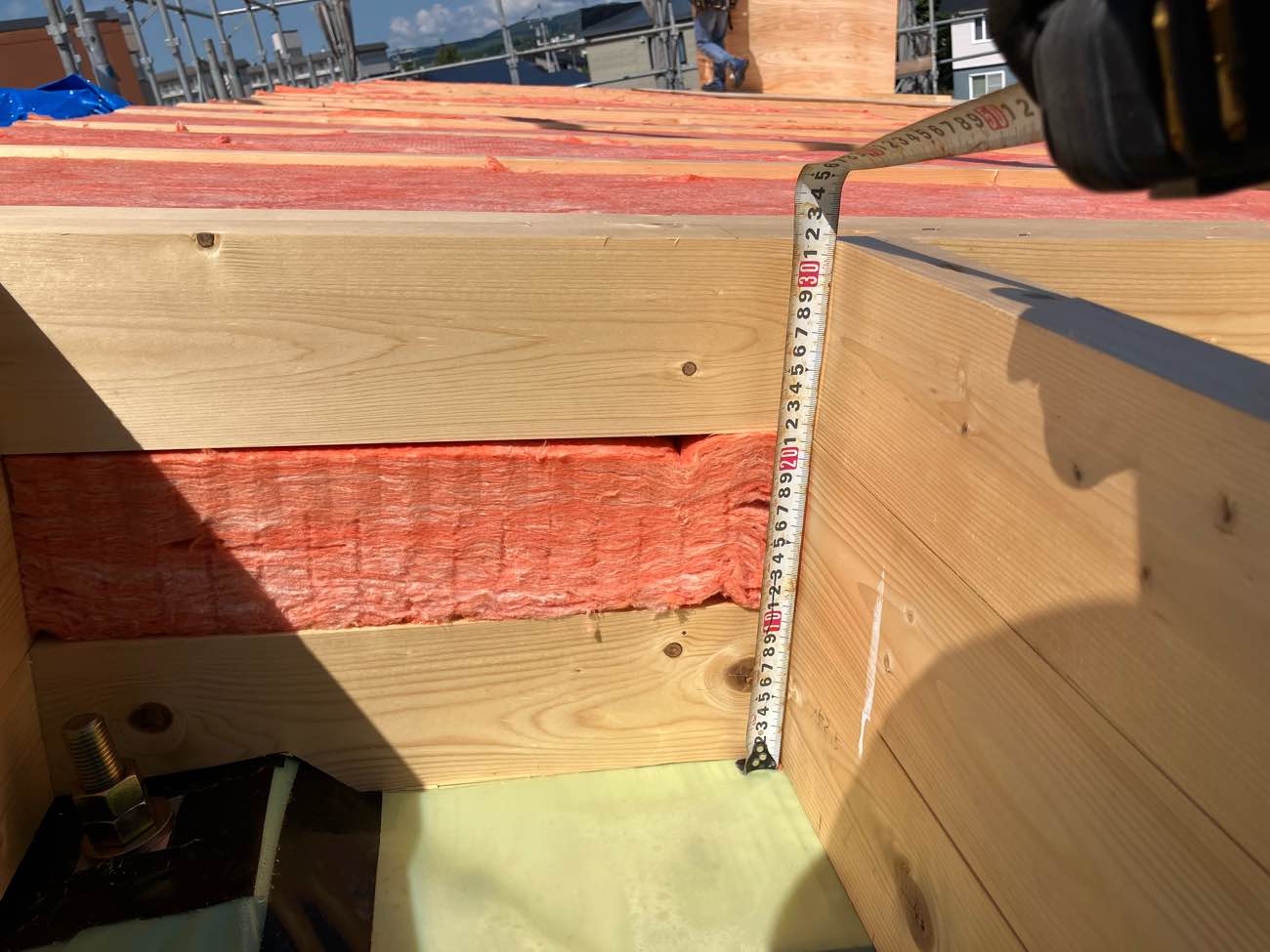 屋根垂木を組んだ間に丁寧に充填していき厚みチェック!