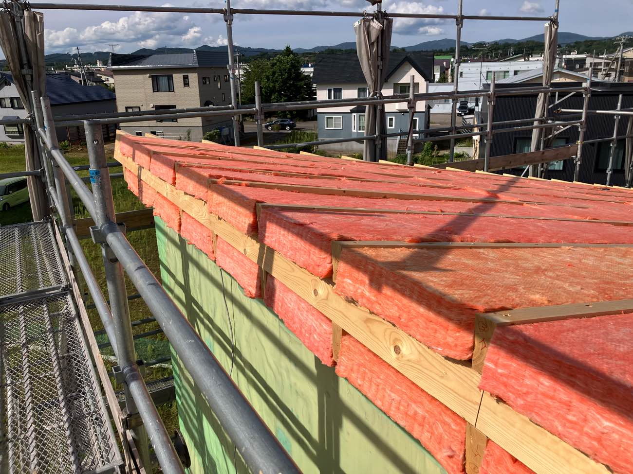 今回の建物の断熱仕様は、外壁面が100mm+100mm合計200mm高性能グラスウール32k、屋根が100mm+100mm+100mm合計300mm高性能グラスウール32kとなります。