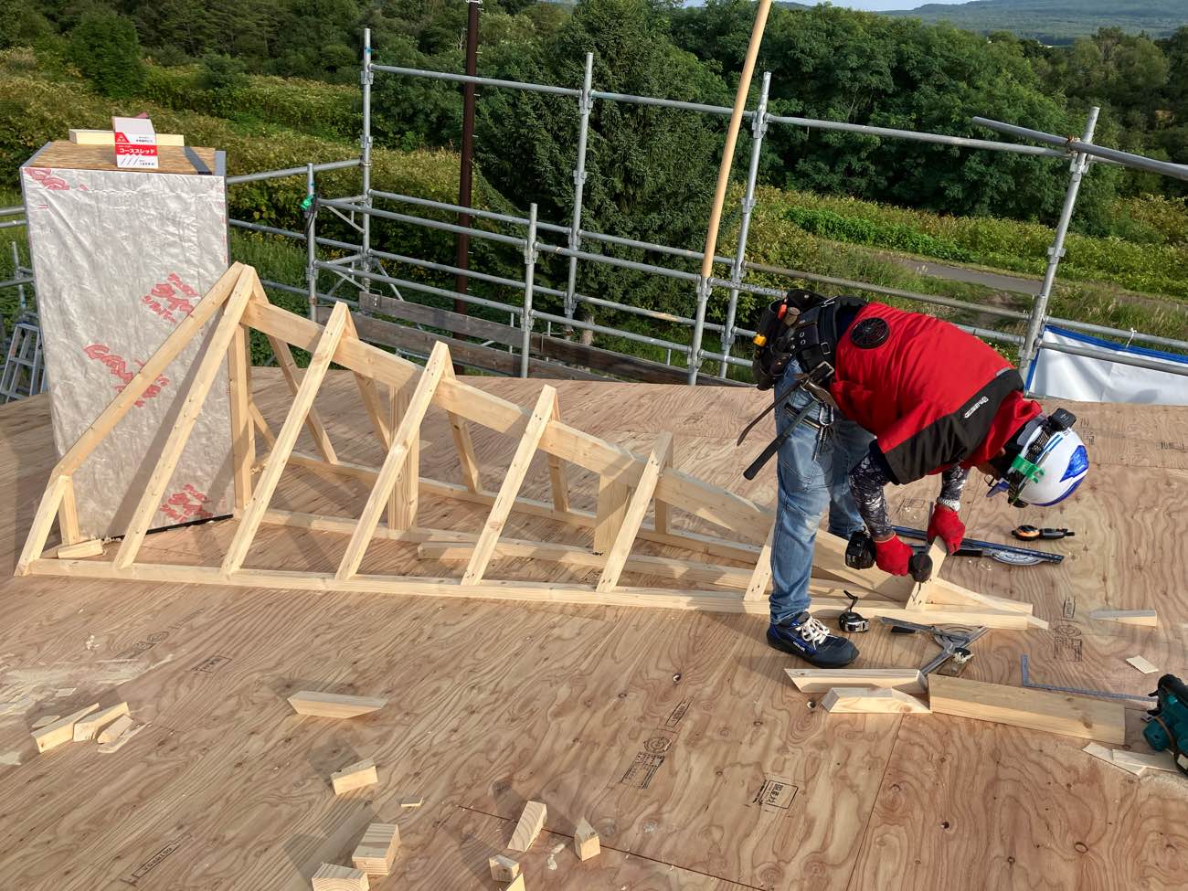2層目の垂木を直行方向に配置し、煙突の骨組みも同時に行います。