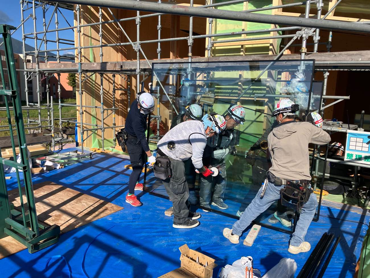 吊り上げられたガラスを職人さんが2階でキャッチします!シンチョウニ…