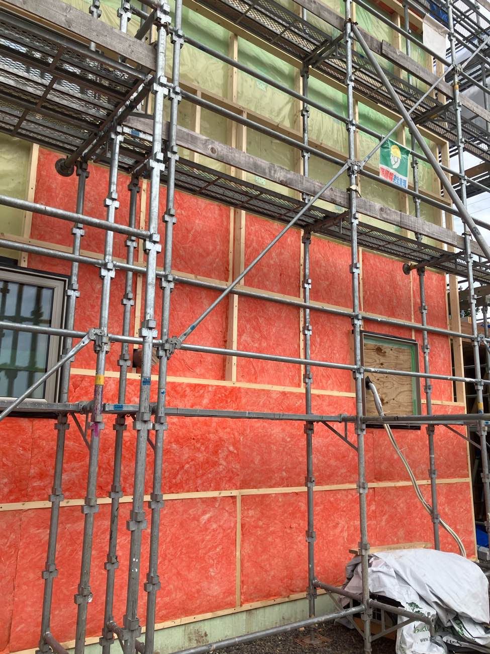 屋根に断熱材がぎっしり詰められているところをお見せしたかと思いますが、外壁の断熱はどうなっているかというと、、、