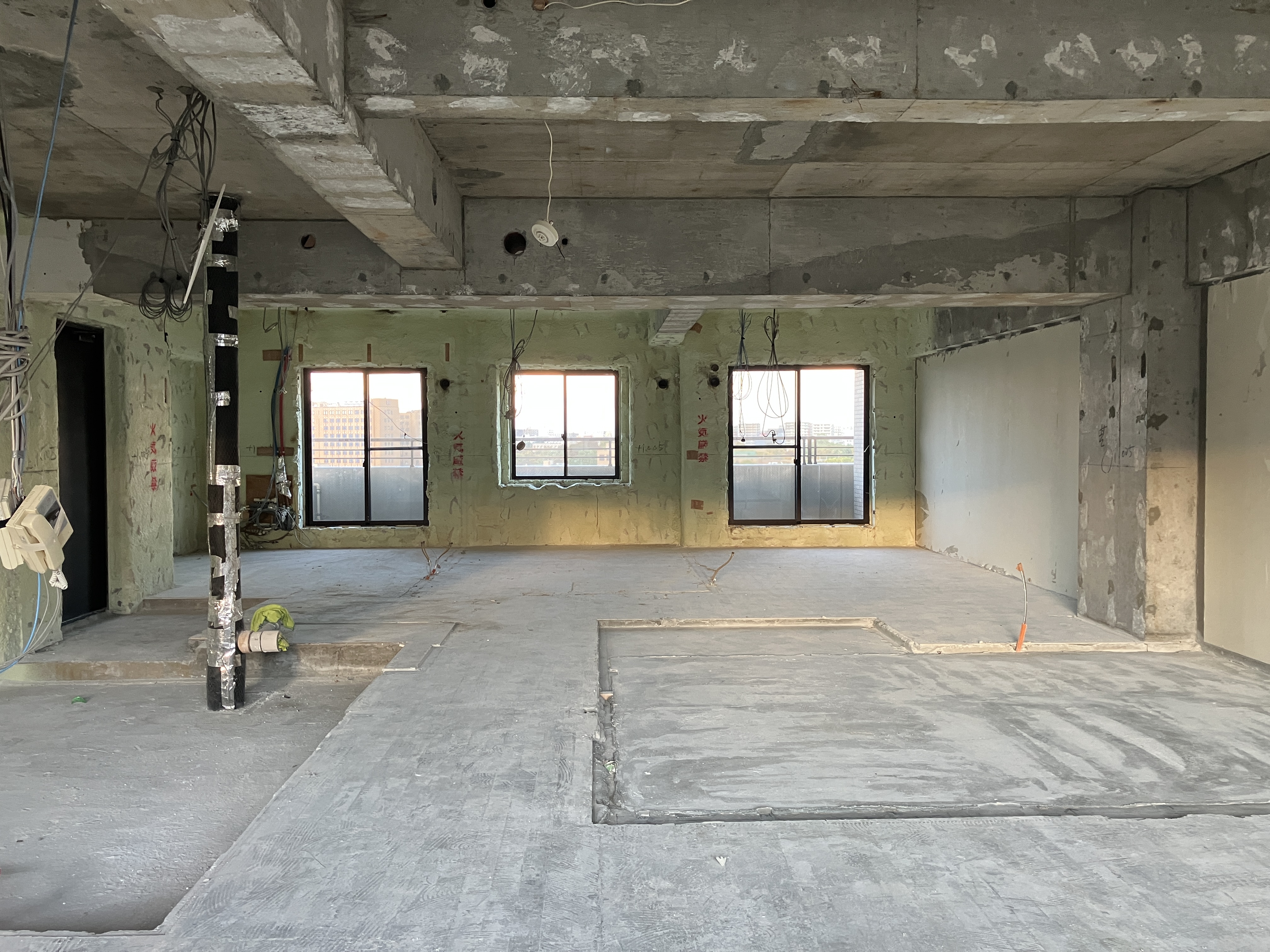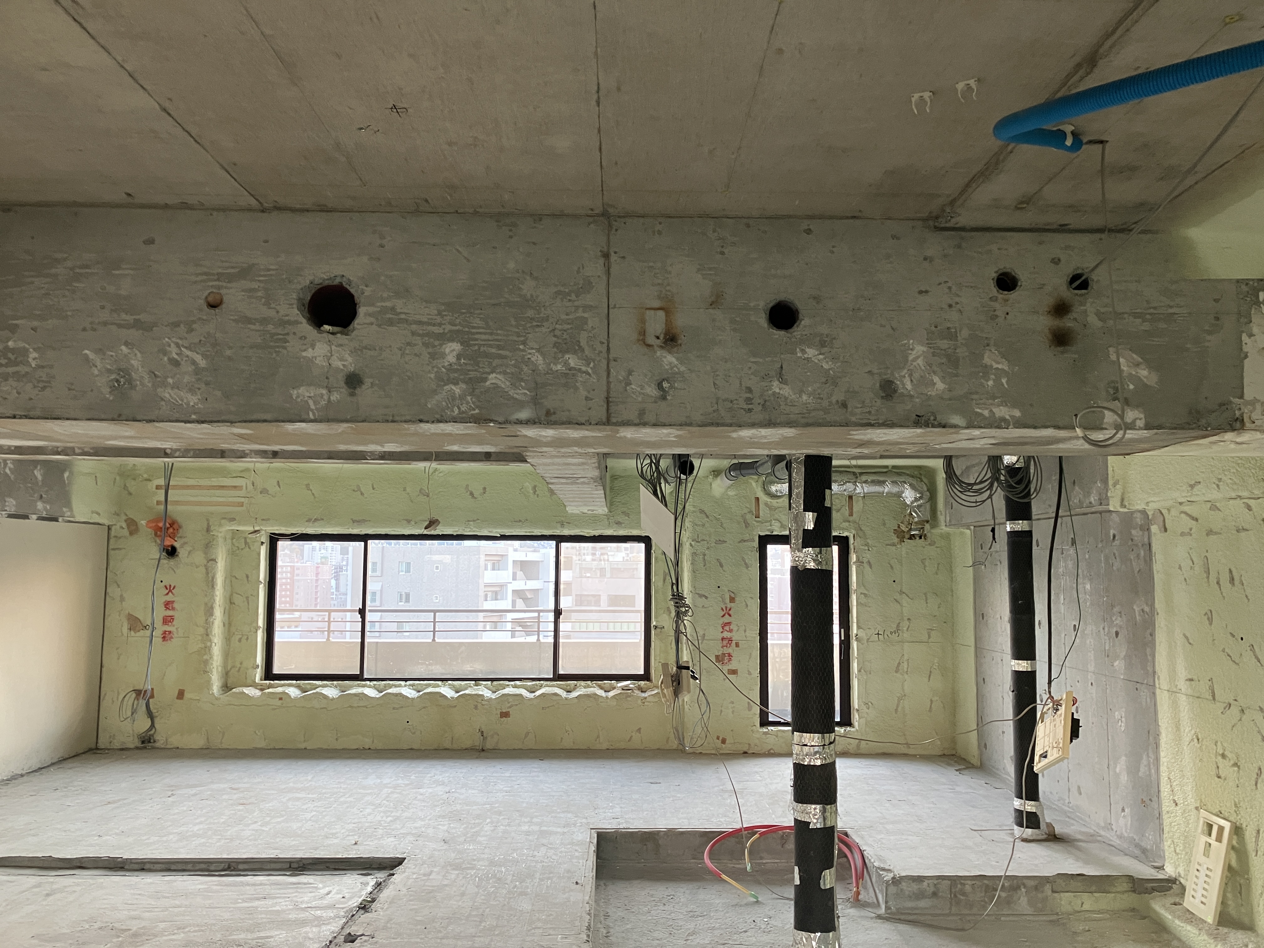 天井高さや壁の位置を決定する為、排水管の位置(写真の黒い棒状のものです)、梁の高さや梁貫通部分の孔の高さや径を測定します。