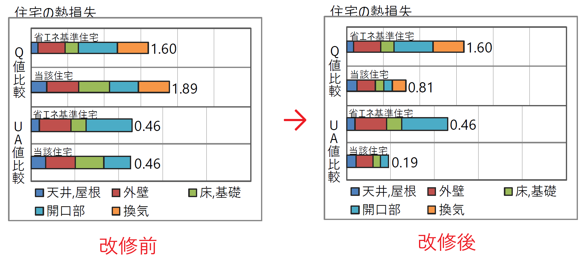 「新木造住宅技術研究協議会」の計算プログラム「QPEX」を使って、改修前と改修後の省エネ計算結果を比較しました。